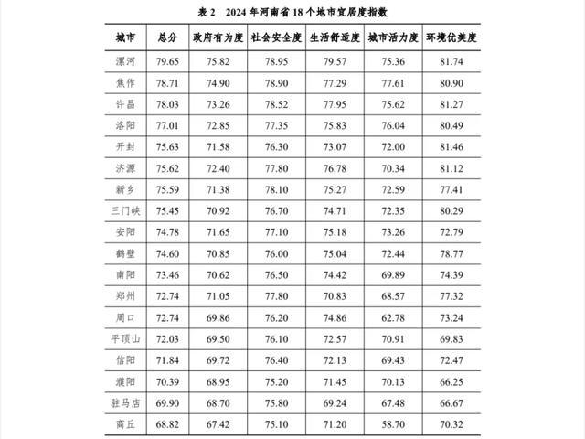 2024年18地市宜居度综合得分差异显著,平均分为74.28分。与2023年相比,13个地市得分实现上升,新乡、周口、三门峡等增幅显著。