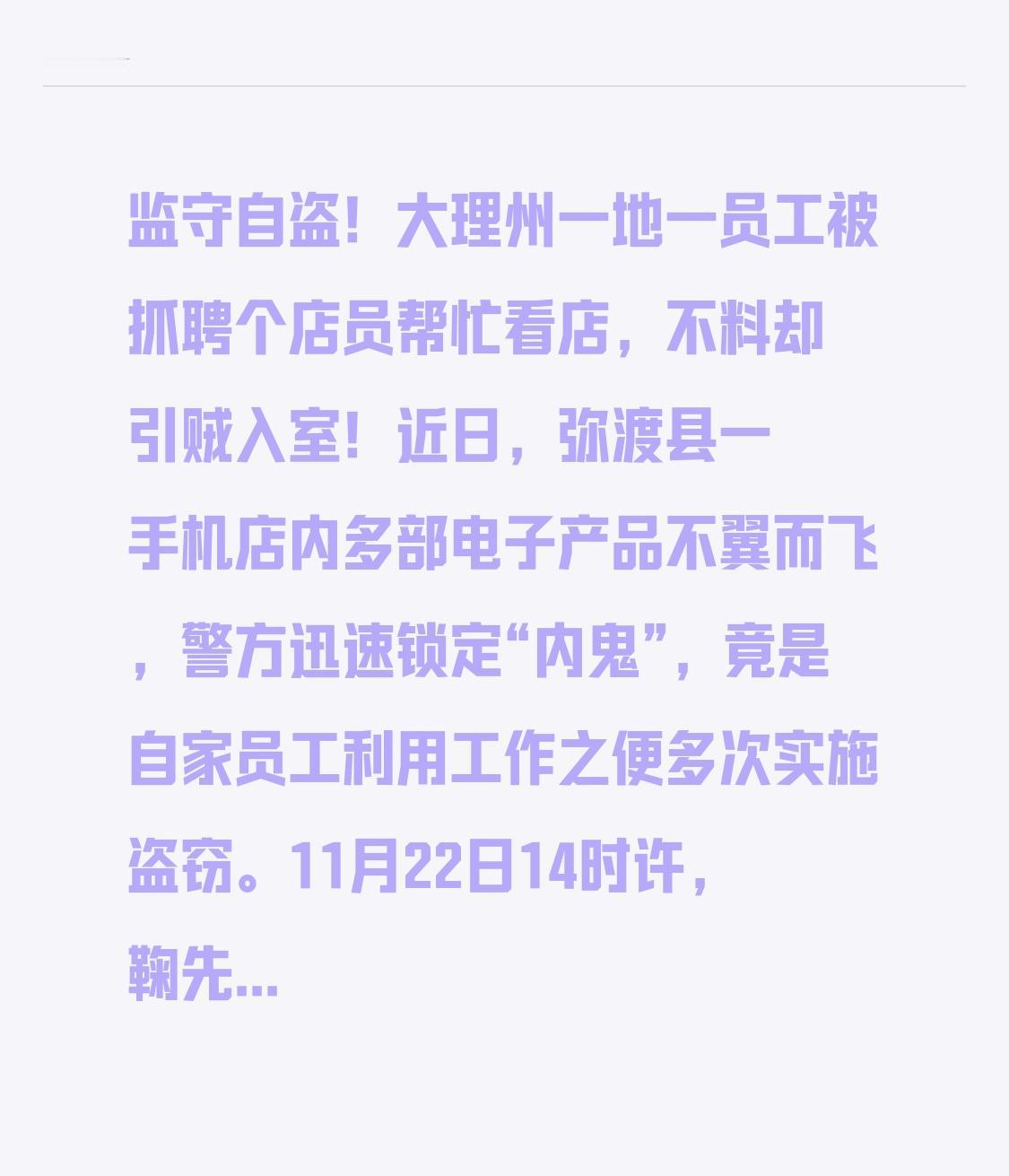 监守自盗!大理州一地员工被抓! 本想雇个店员看店,谁知却招来窃贼! 近日,弥渡县一家手机店内多部电子产品离奇失踪,警方迅速锁定“内鬼”,竟是该店员工利用工作便利多次行窃。 11月22日14时左右,鞠先生报警称,他经营的两家手机专卖店内,手机、平板电脑等物品被盗。接警后,民警迅速赶到现场勘查。据了解,自今年10月中旬起,鞠先生在盘点货物时,陆续发现店内部分手机、平板电脑、智能手表等失窃,损失价值3万余元。 办案民警对现场反复勘查,未发现入室盗窃迹象。结合报案人反映的情况综合分析,曾在店内工作的熊某某有重大作案嫌疑。12月2日13时许,刑侦大队在辖区内将已辞职的熊某某抓获。 👨‍✈️审讯中,熊某某如实交代,因缺钱,他利用身份便利,多次盗窃店内电子产品变卖获利。 目前,犯罪嫌疑人已被公安机关依法刑事拘留,案件正在进一步侦查中。