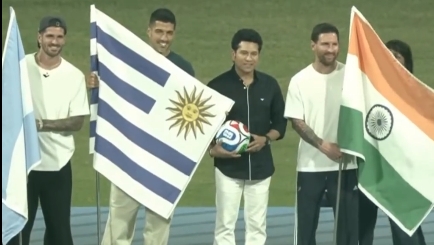 梅西 苏牙 德保罗在活动现场持印度 乌拉圭 阿根廷国旗与嘉宾合影