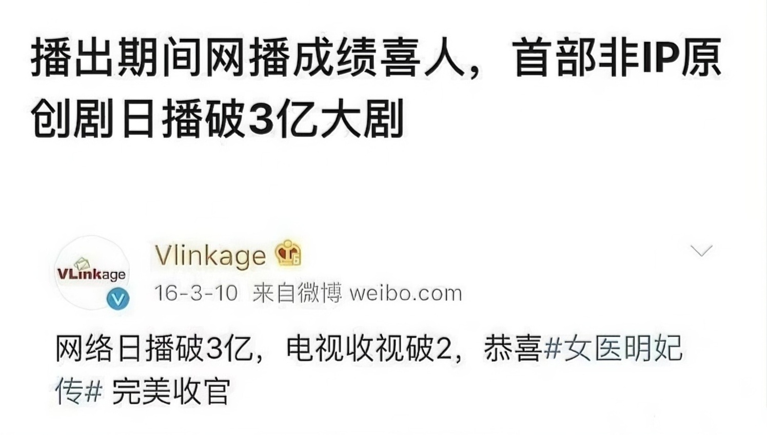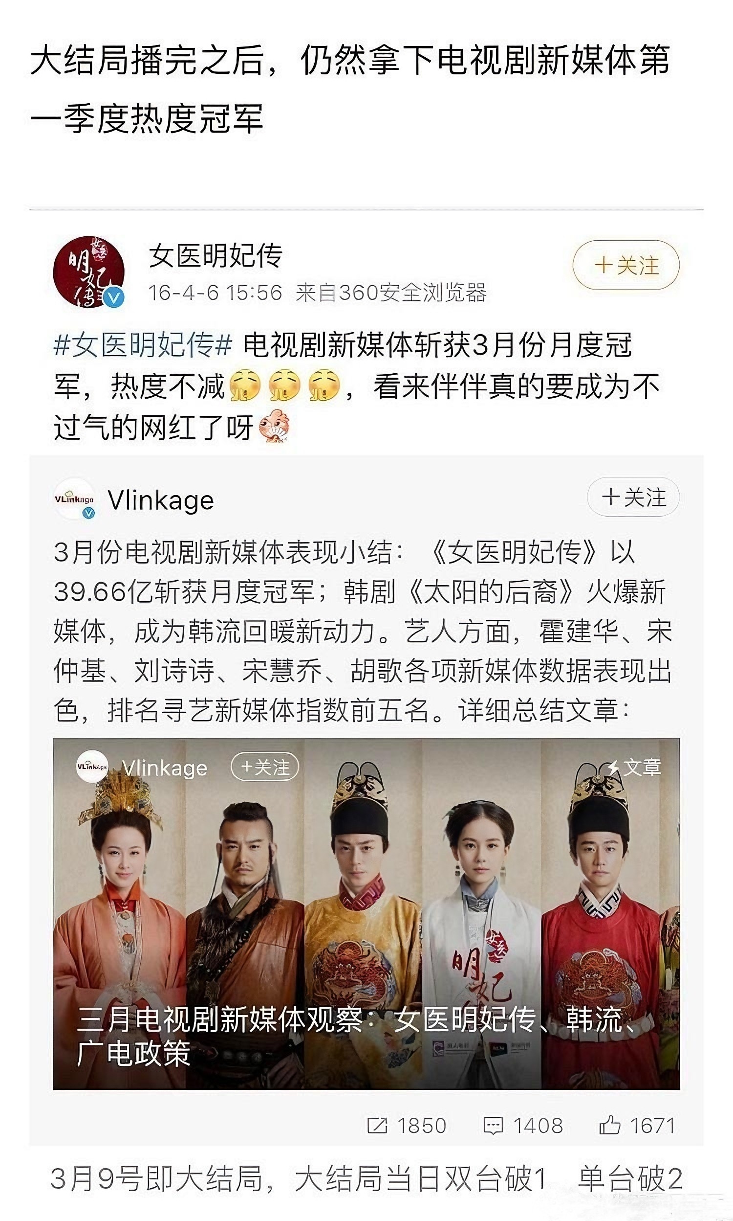 刘诗诗女医明妃传可以说是全方位无短板的大爆剧,不仅收视率强悍,网播量是当年的断层第一!收视率双台均破1,结局破2,一路飙升网播量结局之后依旧拿下电视剧第一季度热度冠军女医明妃传获得金鹰奖优秀电视剧提名五个国家公章的红头文件更是独一份