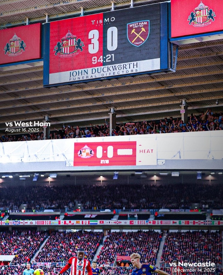德比战待遇,桑德兰主场电子比分牌并未显示纽卡队徽