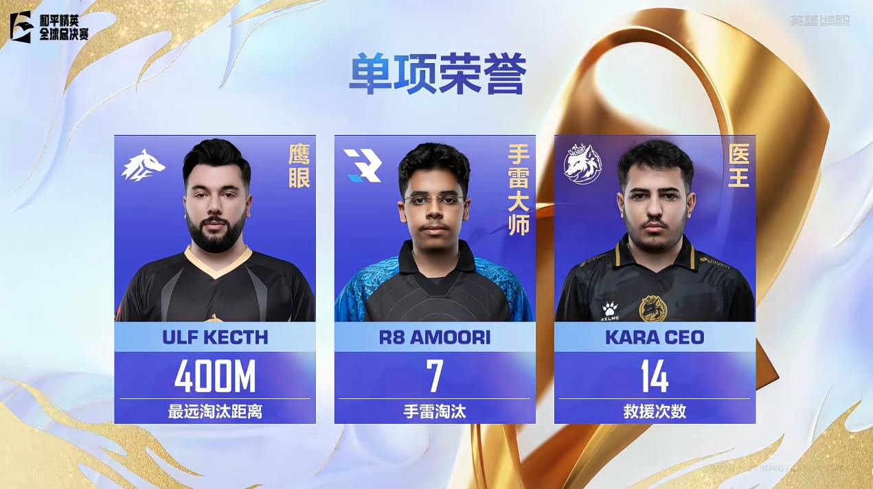 虎扑12月14日讯2025和平精英全球总决赛决赛赛段,ULF-KECTH/R8-AMOORI/KARA-CEO三位选手分获“鹰眼”“手雷大师”“医王”单项荣誉。