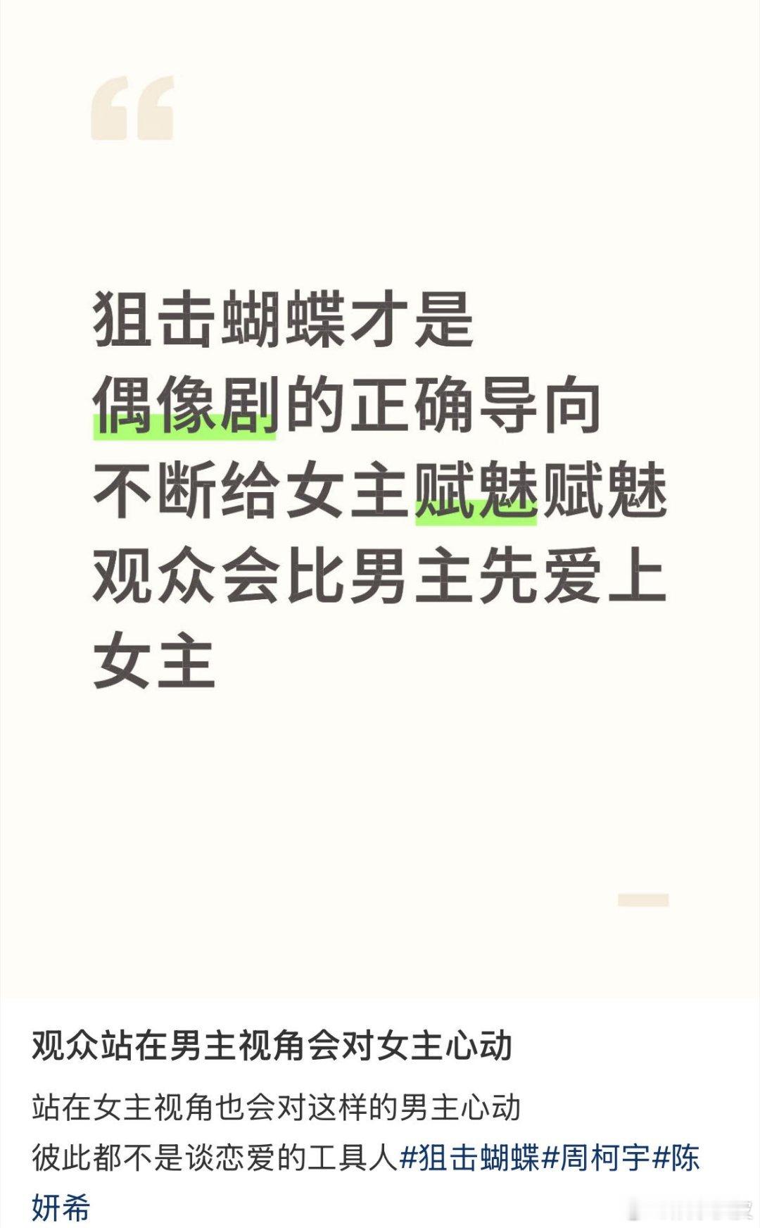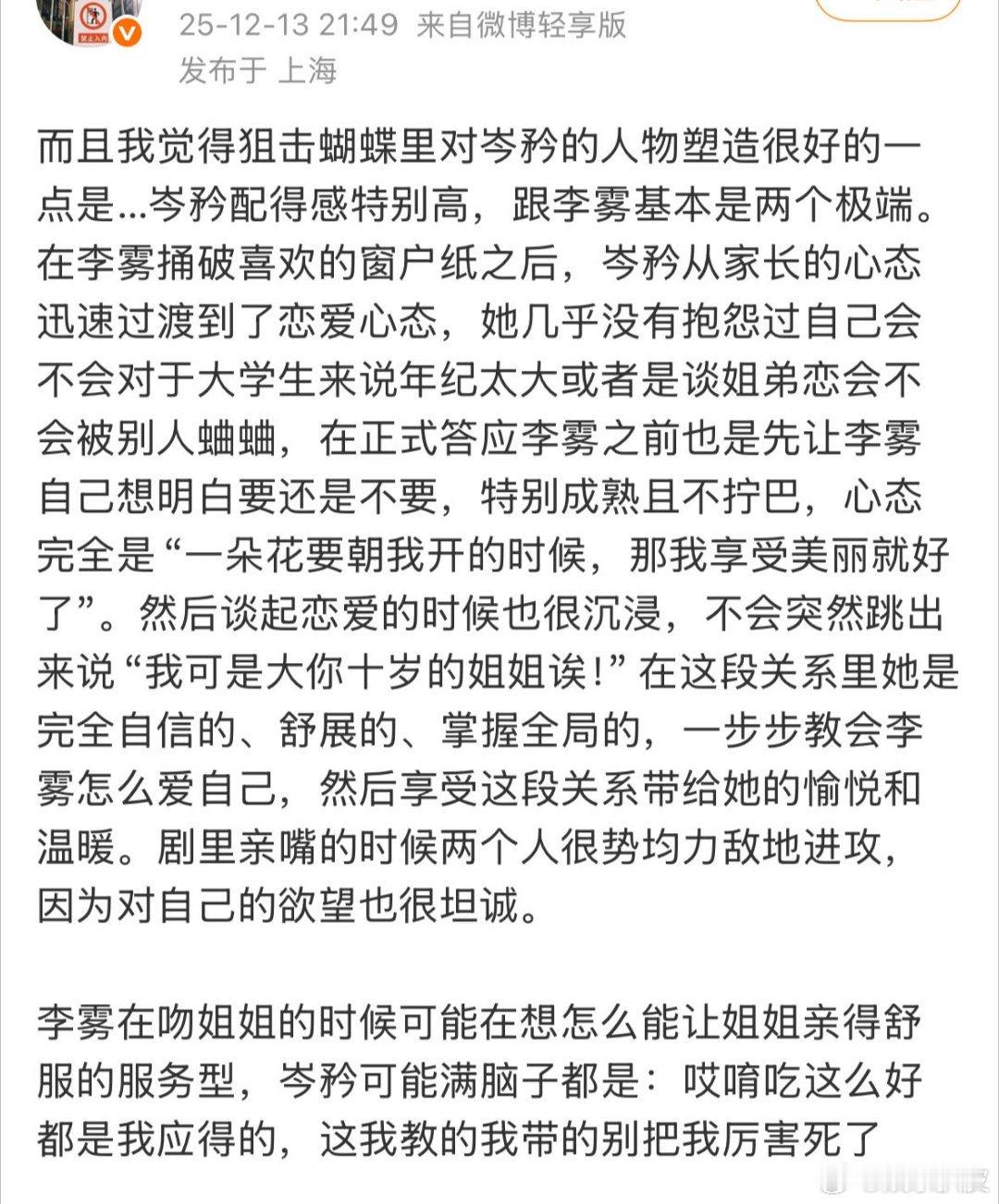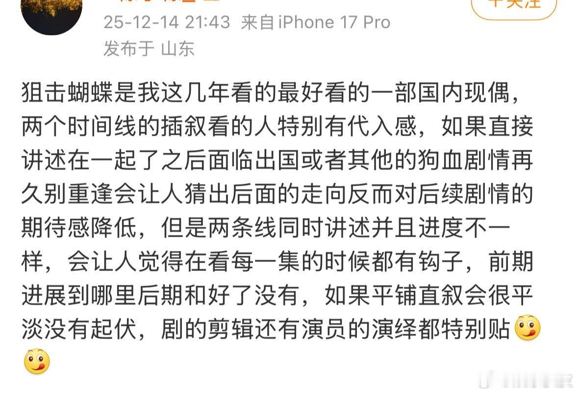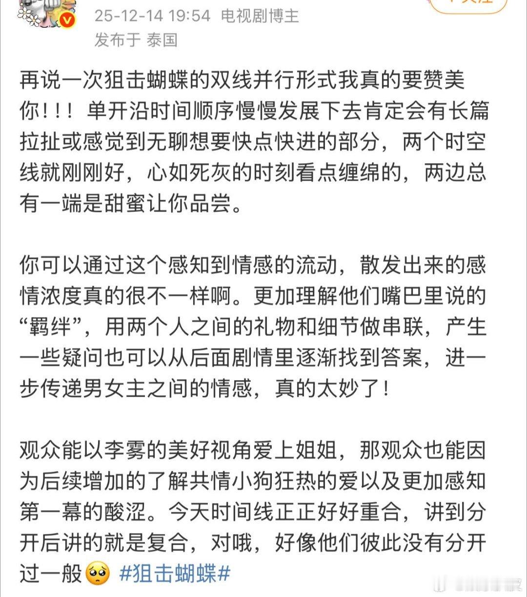 狙击蝴蝶分手复合在同一集 别管了!看这个《狙击蝴蝶》苹果肌就没扁平过!虽然没什么强剧情强爆点,但每集的感情流动就是很细腻,不管是爱人、亲人,还是朋友之间的脉脉温情都很温暖…导演、演员和制作团队功力通通在线!不需要开倍速是我对这个剧的最高评价!而且二刷的时候依然可以看得津津有味!或许这才是看长剧的意义吧!嘉行我承认之前对你太大声了!这个《狙击蝴蝶》我爽而看之!!