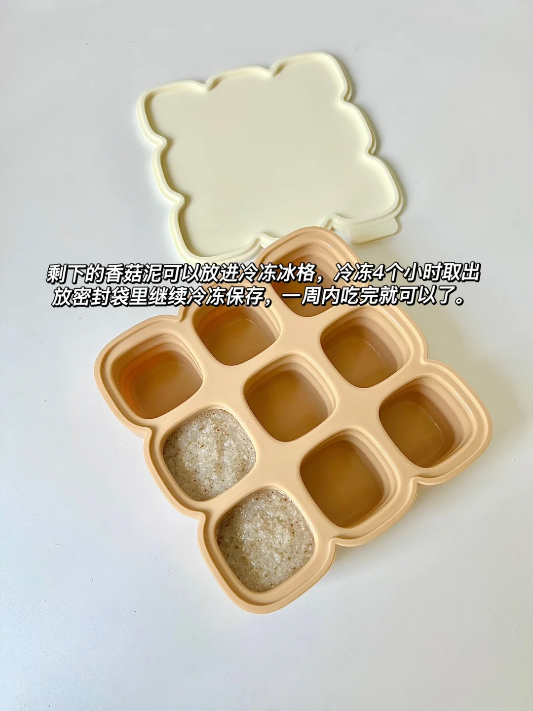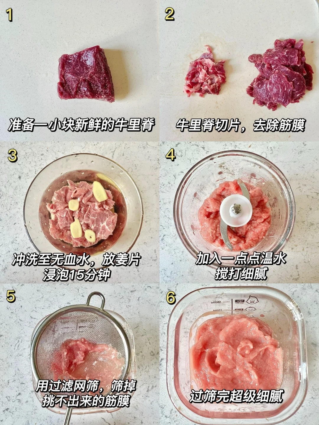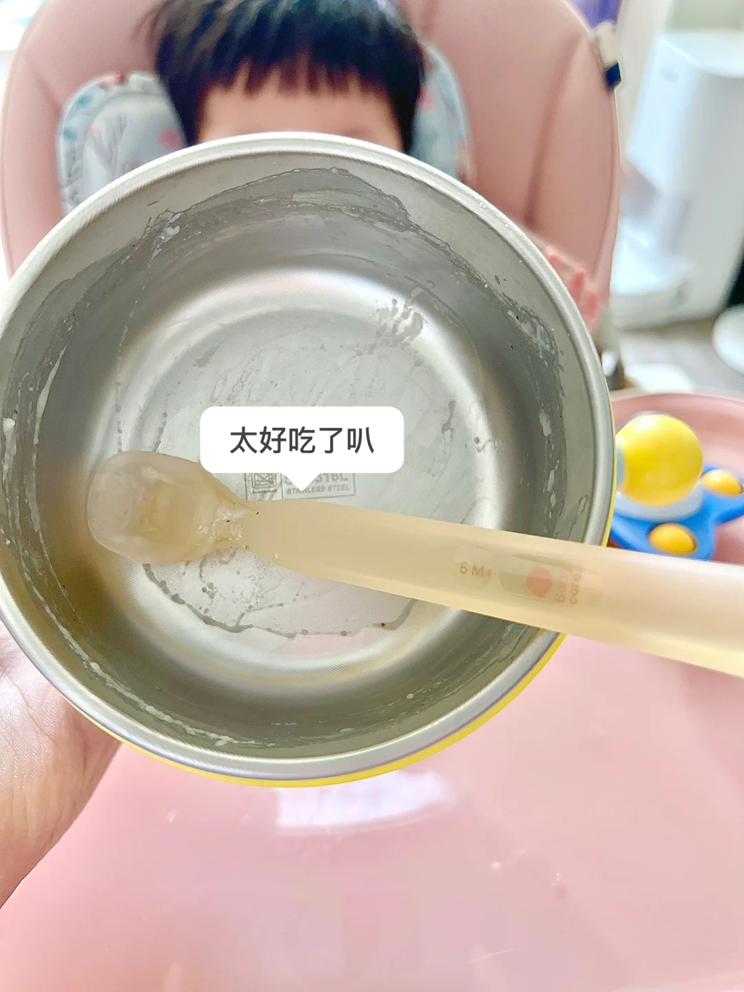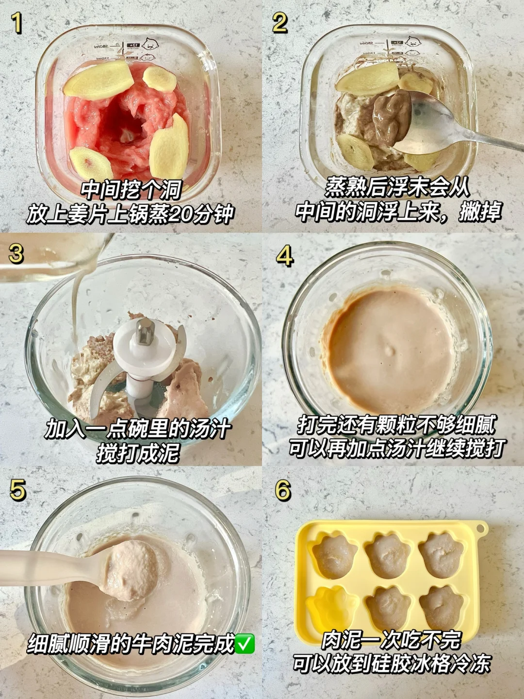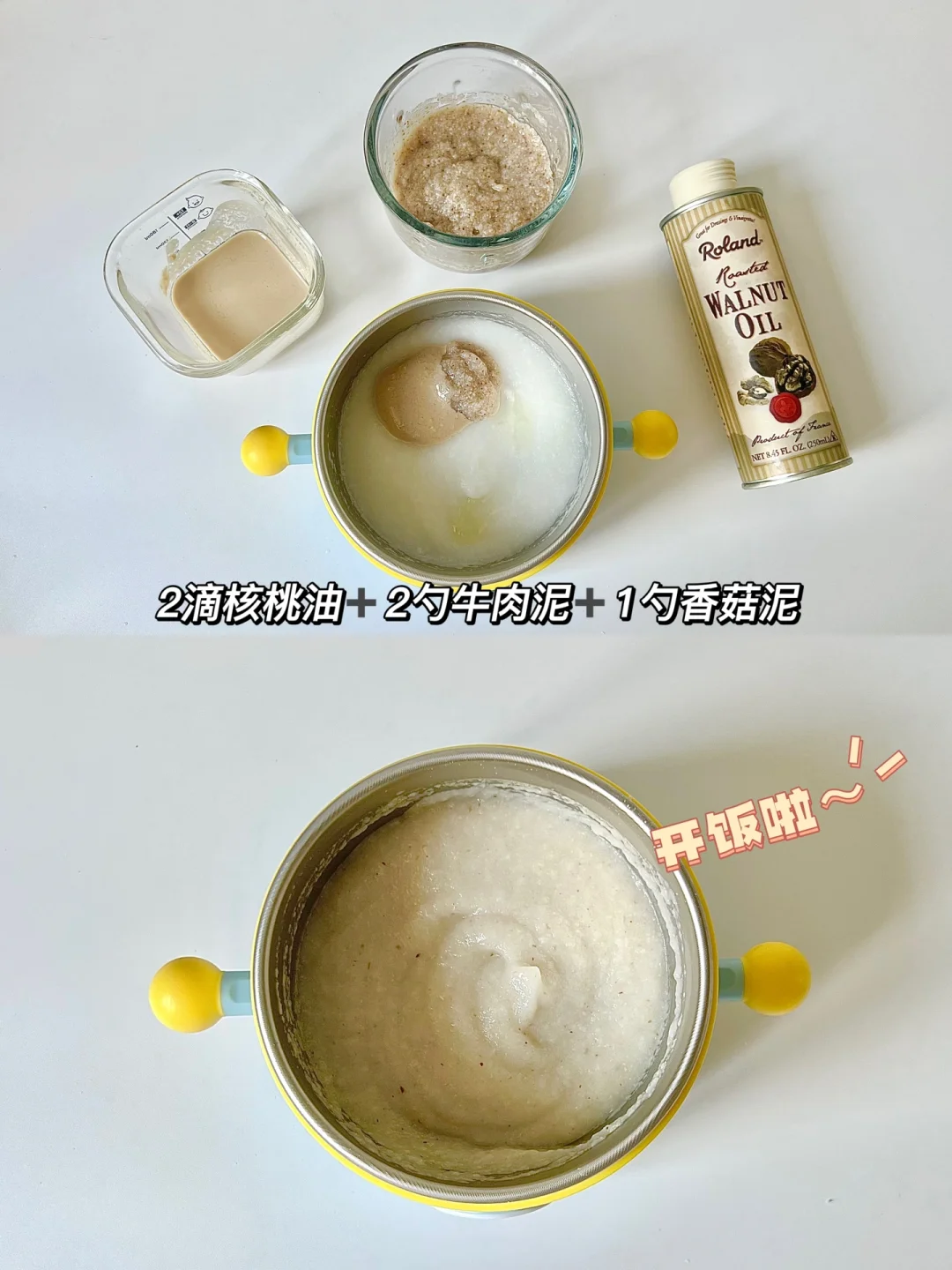 📝:10g米粉➕90ml水➕2滴核桃油➕2勺牛肉泥➕1勺香菇泥
