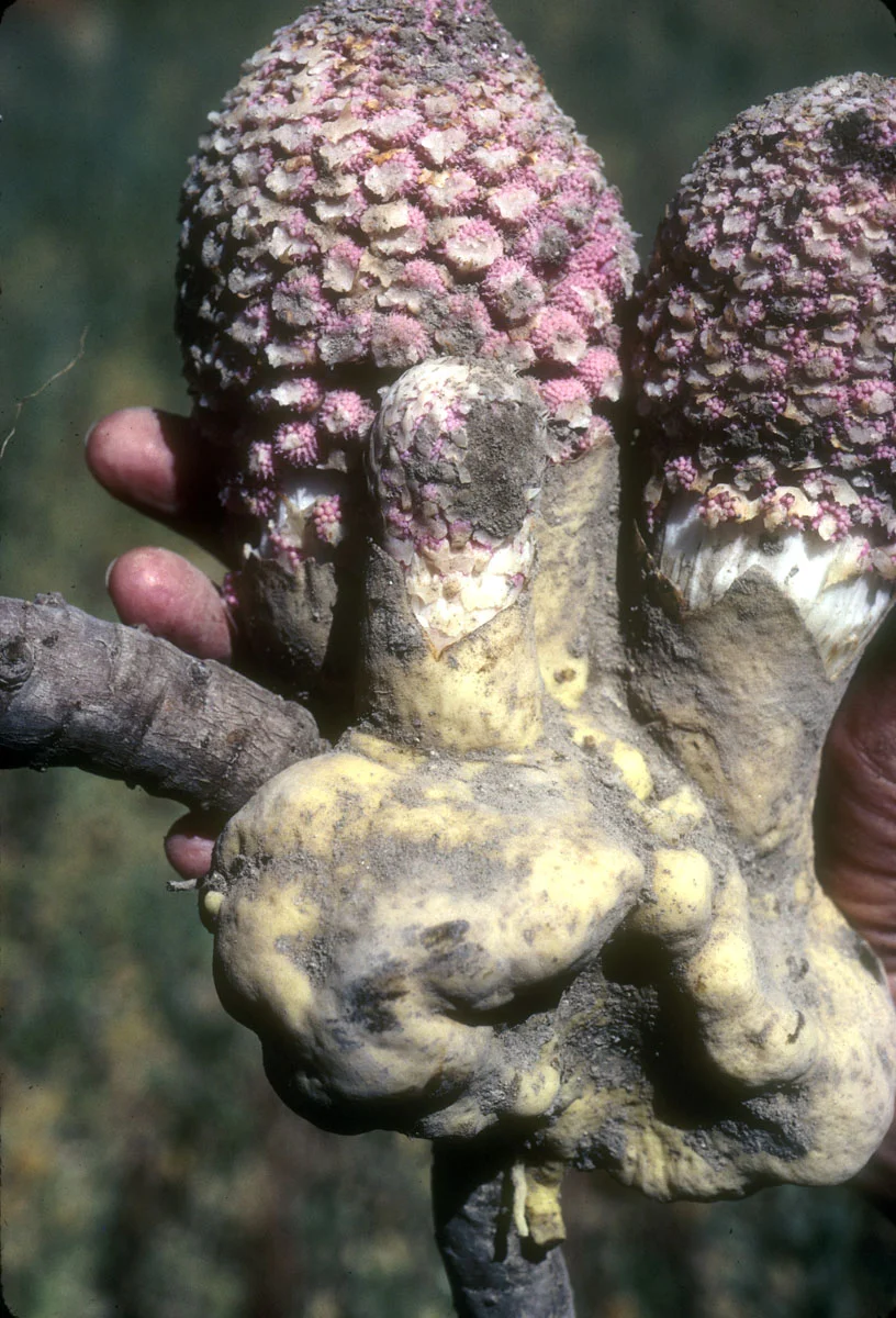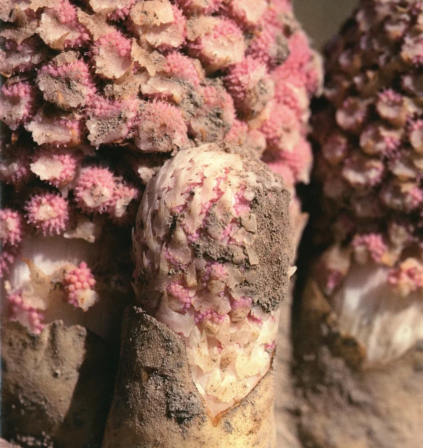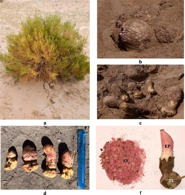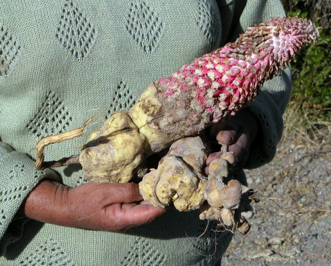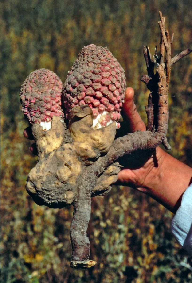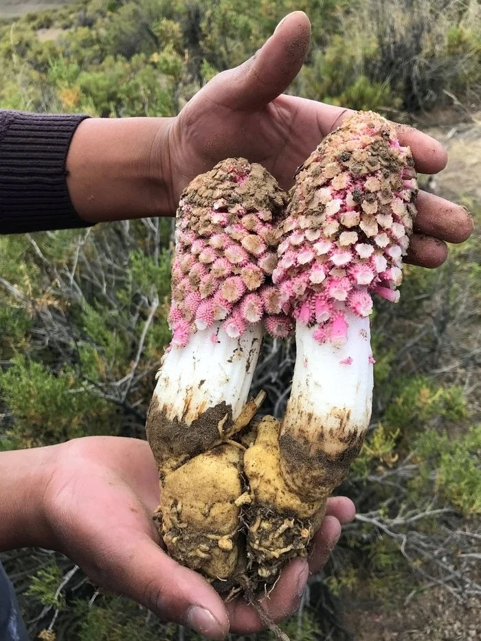 Ombrophytum subterraneum 檀香目蛇菰科 一种寄生植物,形成圆形、淀粉质的地下块茎,以暗藻为食。 它没有芽或叶,但形成细茎,以寻找并生长成新的寄主根。这种奇异紧凑的地下花序结出的果实也是可食用的,带有甜的水果味,在南美洲被认为是一种美味。 原产于安第斯山脉沿岸,从厄瓜多尔到智利和阿根廷,海拔500至4000米。 以首蓿或三叶草为寄主进行种植的尝试取得了成功。