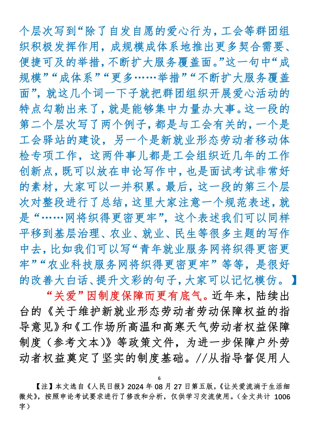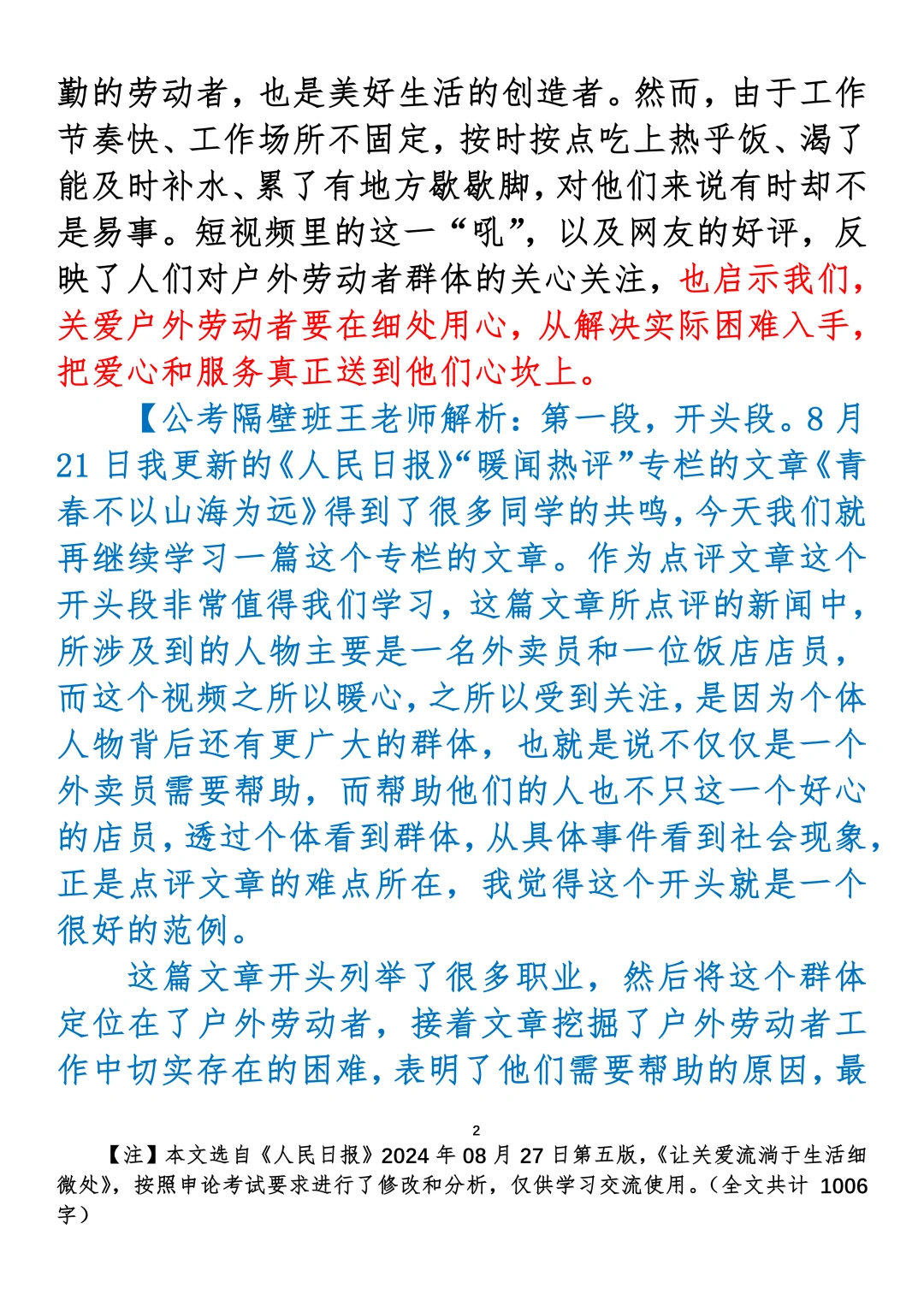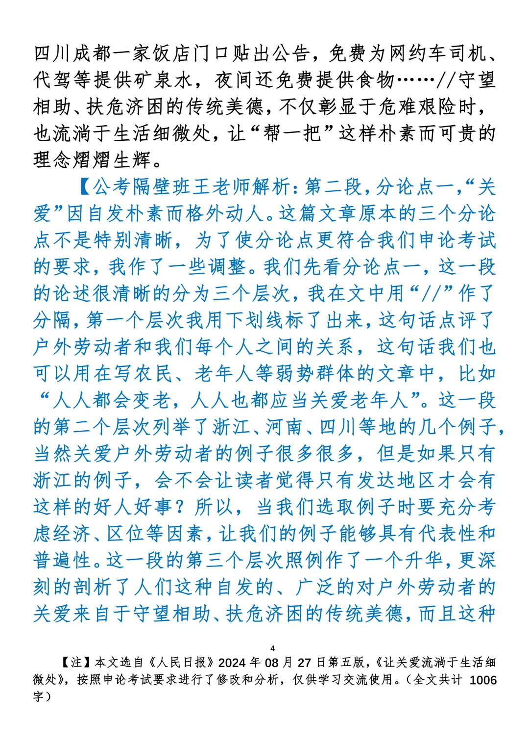 如何抄写:每日抄写文章发在“公考隔壁班王老师”账号,红色字是重点句和结构句,黑色字是正文,蓝色字是解析,大家抄写时不必抄蓝色字。建议先通读全文,做到心中有数再开始抄写,效果会更好。 关于文章:抄写文章来源于人民日报,但每篇文章我都根据申论考试要求进行了修改:一是重写或修改开头、结尾;二是统一段首句句式结构;三是调整段落字数,使文章结构更均衡;四是简化复杂长难句,使之更具可模仿性。每篇文章无论修改多少,都是基于申论考试要求,毫无对人民日报文章品评之意。(此处致敬人民日报)