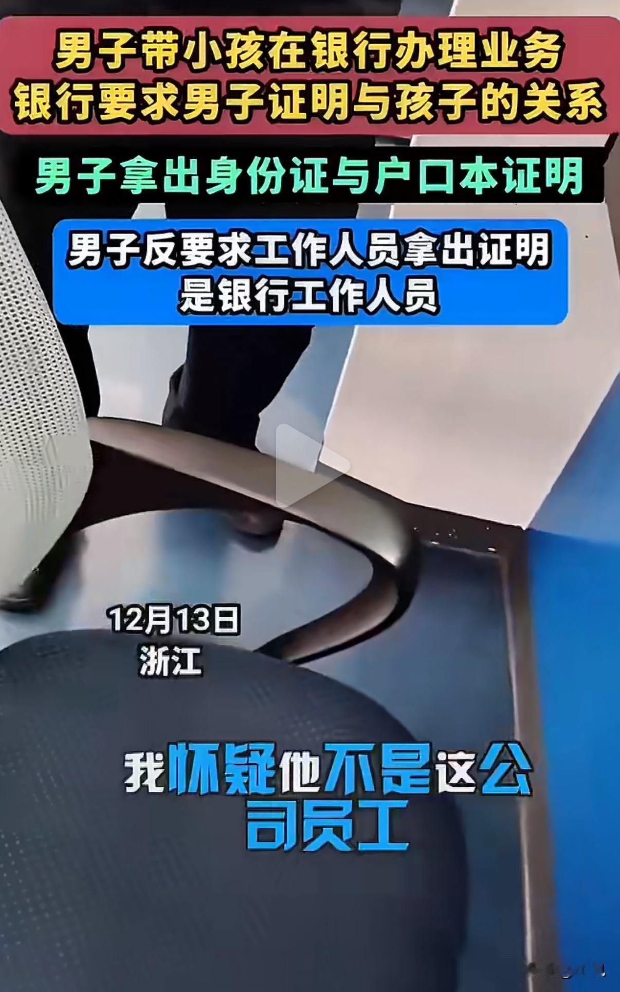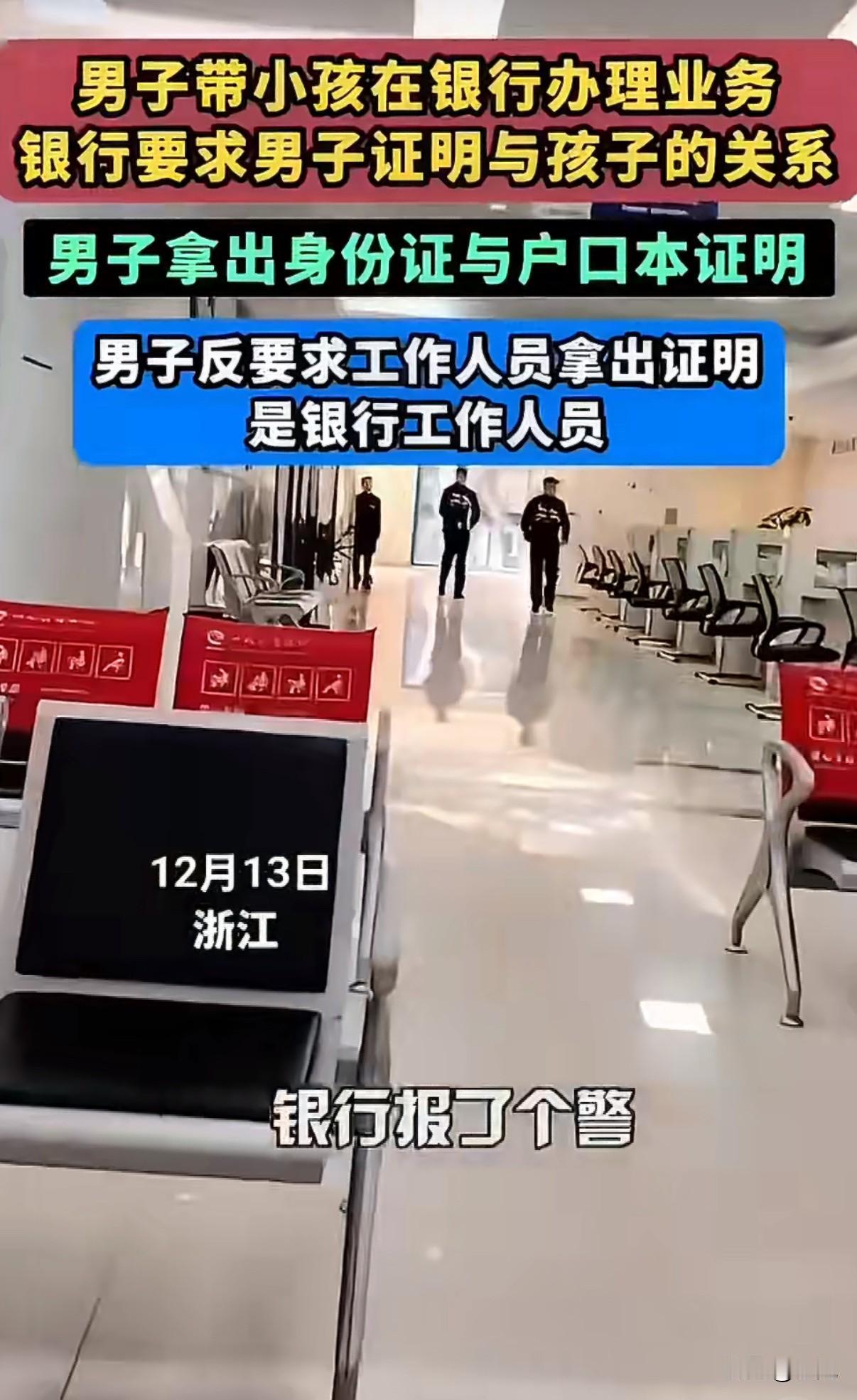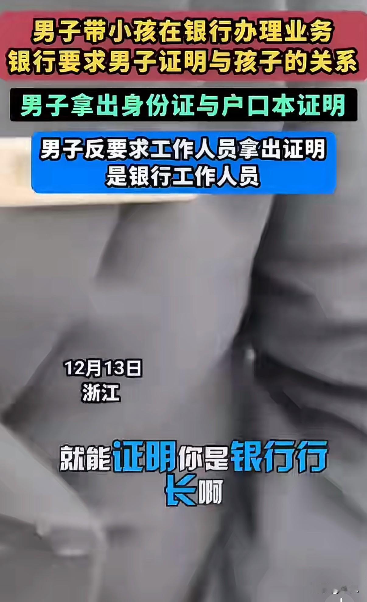 干得漂亮!银行要我证明儿子是我儿子?那我也要你证明你是银行的人! 浙江衢州一男子带孩子办业务,遭遇了这么一档子事。他拿着孩子身份证,银行工作人员说不行,得证明你们是父子。 男子一开始挺配合,翻手机找户口本照片。工作人员看了照片,又说不行,得要原件。男子火气一下就上来了。 他反问工作人员:“你凭什么查我证件?你先证明你是银行的人,把劳动合同拿出来我看看。” 工作人员愣住了,没想到会被反将一军。双方就在柜台前吵了起来。男子态度很坚决:你要我自证,那你也得自证。 银行后来来了个戴牌子的,自称是行长。男子连这位“行长”也没放过:“你的牌子谁都能做,我要看盖章的劳动合同。” 场面一度僵持。最后银行没办法,从总行调来了那位工作人员的劳动合同复印件,这事才算完。 事后很多人说男子较真,他特意发视频回应:我不是无理取闹,是讲道理。 这事有几个细节挺有意思。一开始银行认户口本照片,后来改口要原件,标准为什么变?男子抓住的逻辑是,你要我证明关系,那你的身份谁来证明? 有些网友觉得解气,认为这是对银行“双重标准”的一次反击。也有觉得没必要,配合一下就行了。 但我仔细想想,银行验证客户信息是职责所在,可流程是不是该统一?客户要求验证工作人员身份,这个要求本身,又该不该被满足? 这件事没有谁对谁错的简单答案。它更像一面镜子,照出了服务行业中,权利与义务的边界在哪里。 你们觉得,这场争执里,谁更有理?