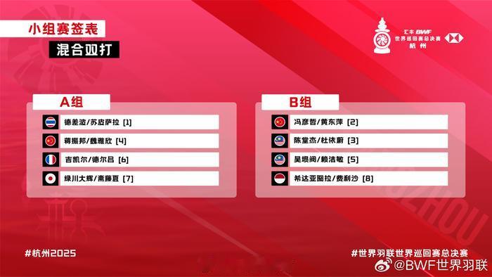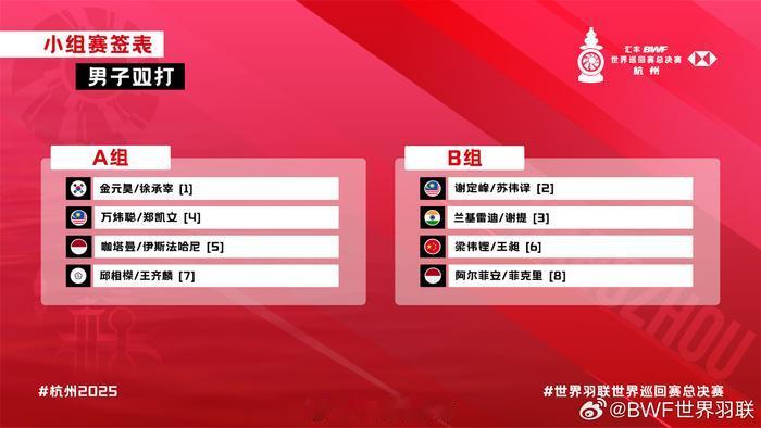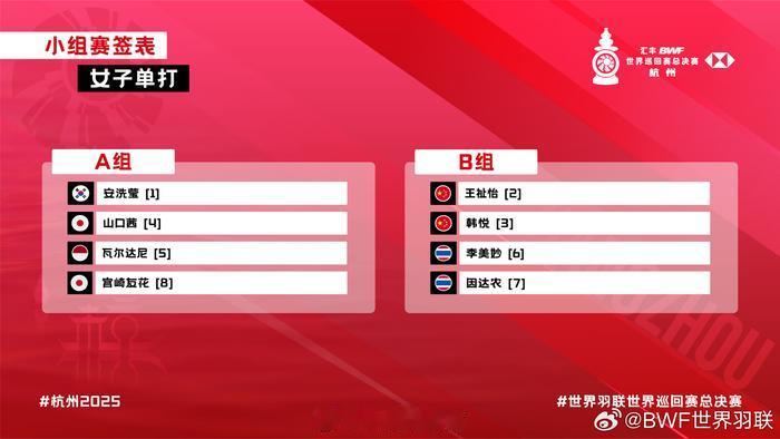 2025年世界羽联年度总决赛小组赛形式分析:男单石宇奇和混双世界第一第二出线胜率很高 ‌抽签:抽签仪式已于12月13日举行。 颁奖‌:年度最佳运动员颁奖晚宴定于12月15日。‌‌值得期待! 参赛名单与分组情况 ‌中国选手阵容‌: 男单:石宇奇、李诗沣(同处B组),同组还有羽联周天成和大魔王奈良冈功大。‌‌ 女单:王祉怡、韩悦(同处B组,上届冠军王祉怡),同组还有泰国两美女李美妙、因达农。‌‌ 女双:贾一凡/张殊贤(A组)、刘圣书/谭宁(B组,世锦赛冠军组合)。 混双:冯彦哲/黄东萍(B组)、蒋振邦/魏雅欣(A组)。‌‌ 男双:国羽仅梁伟铿/王昶一对入围(独闯B组“死亡之组”),同组还有印度黑塔兰基雷迪/谢提,世界排名第二的大马强档谢定峰/苏伟译,印尼新组合阿尔菲安/菲克里(实力强劲)。 ‌小组焦点‌战: 1,男单B组形势明朗,石宇奇和李诗沣对阵周天成、奈良冈功大,从目前的状态来看,只要石头哥和李诗沣正常发挥,小组出线概率很高。‌‌ 2,女单B组中泰对决,王祉怡和韩悦迎战泰国两美女李美妙、因达农,国羽两朵金花出线胜率很高,王祉怡对阵李美妙5-1,对阵因达农最近三次是2-1,韩悦对阵李美妙是9-4,对阵因达农最近两次2-0胜出。‌‌ 3,男双B组梁伟铿/王昶面临印度黑塔、印尼、马来西亚强敌,被称“死亡之组”,小组出线不容乐观,需加油拼搏。‌‌ 4,女双项目,两对中国组合分别被分在A、B组。贾一凡/张殊贤将遭遇两对日本组合和一对马来西亚组合,小组出线不容乐观。而刘圣书/谭宁则将遭遇两对韩国组合和一对中国台北组合,出线胜率很高。 A组:陈康乐/蒂娜、贾一凡/张殊贤、福岛由纪/松本麻佑、岩永铃/中西贵映 B组:金慧贞/孔熙容、刘圣书/谭宁、白荷娜/李绍希、谢沛珊/洪恩慈  5,混双项目,目前世界排名第一的蒋振邦/魏雅欣、第二的冯彦哲/黄东萍、分别在A、B组,按照目前的实力,两对中国组合出线的问题不大。 A组:蒋振邦/魏雅欣、德差波/苏皮萨拉、吉凯尔/德尔吕、绿川大辉/斋藤夏 B组:冯彦哲/黄东萍、陈堂杰/杜依蔚、吴埙阀/赖洁敏、希达亚图拉/费利沙  赛程安排与观赛信息 ‌完整日程‌:12月17日-18日小组赛,19日休整,20日半决赛,21日决赛。‌‌