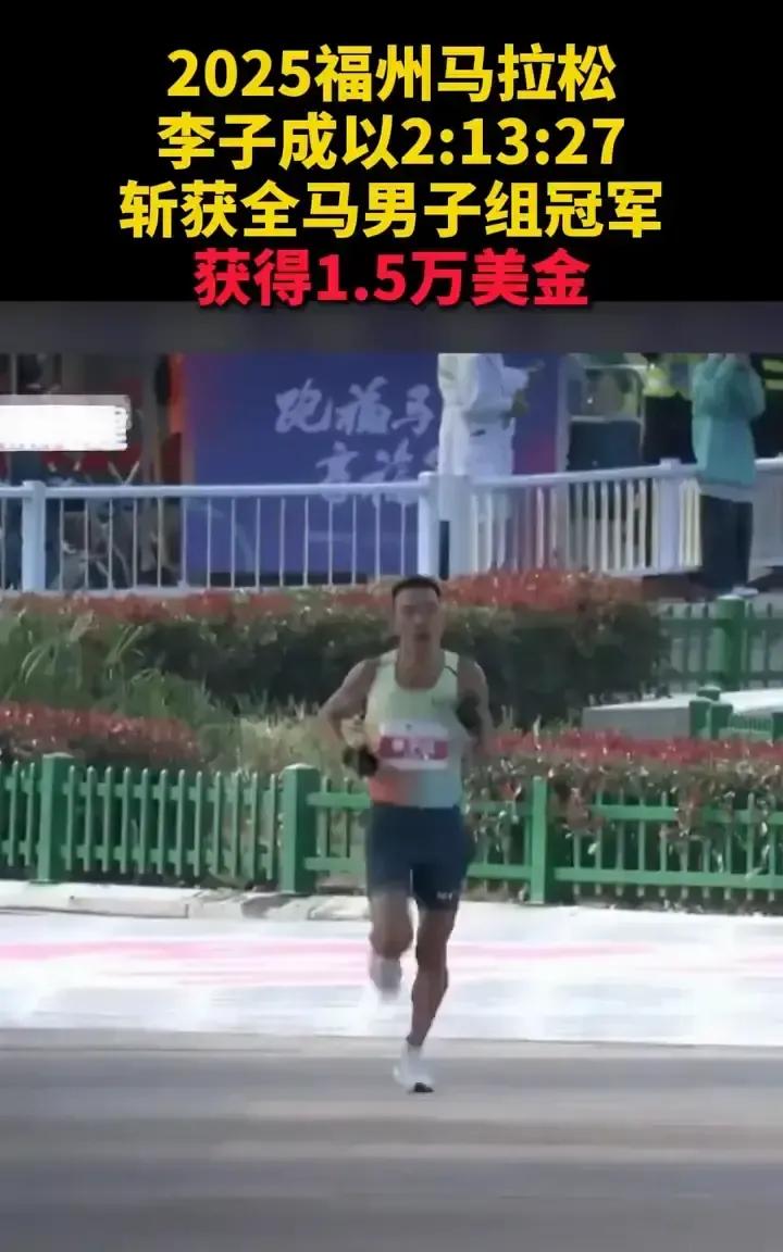 谁说中国马拉松不行?今天,福州的街道被一个中国名字撕开了口子。 李子成从路边小店的烟火气里冲出来,计时牌停在2小时13分27秒。他甩开身后的肯尼亚选手38秒,把冠军奖金攥在手里。这不是黑马逆袭,是卫冕。 四个月前的武汉,他跑出2小时11分;柏林马拉松的赛道,他也闯过。这次,福州的沥青路记录了他42秒的自我超越。肯尼亚和埃塞俄比亚的对手,这次看着他的背影。 他冲线时,赛道旁的光伏板正在发电。这场马拉松的碳排放是零。冠军的脚印,没给城市留下负担。 1.5万美元奖金落袋,省里的破纪录奖还在前方。但他攥紧的,是下一场出发的资格。中国男子马拉松的每一步,都在丈量世界。 从前我们守护脚下的路,今天我们征服前方的路。