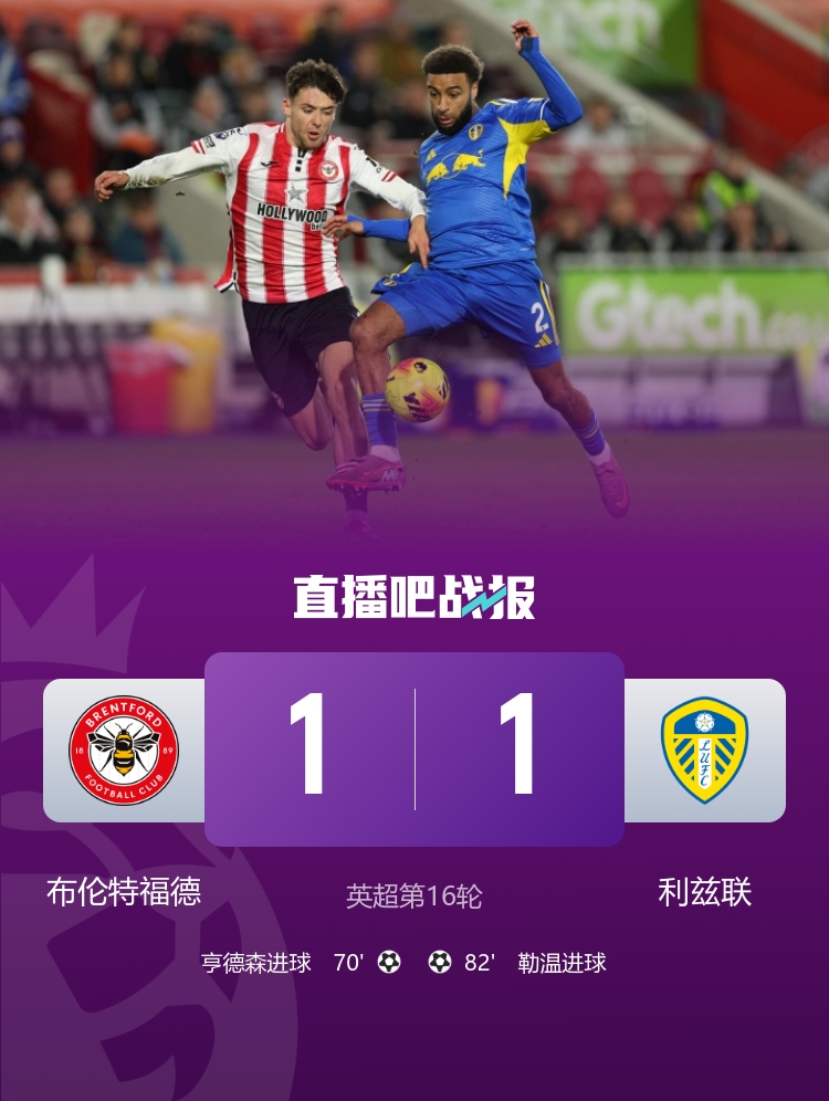 第82分钟,尼翁托右路送出传中,勒温禁区中路高高跃起头球扳平比分,利兹联1-1布伦特福德。↓