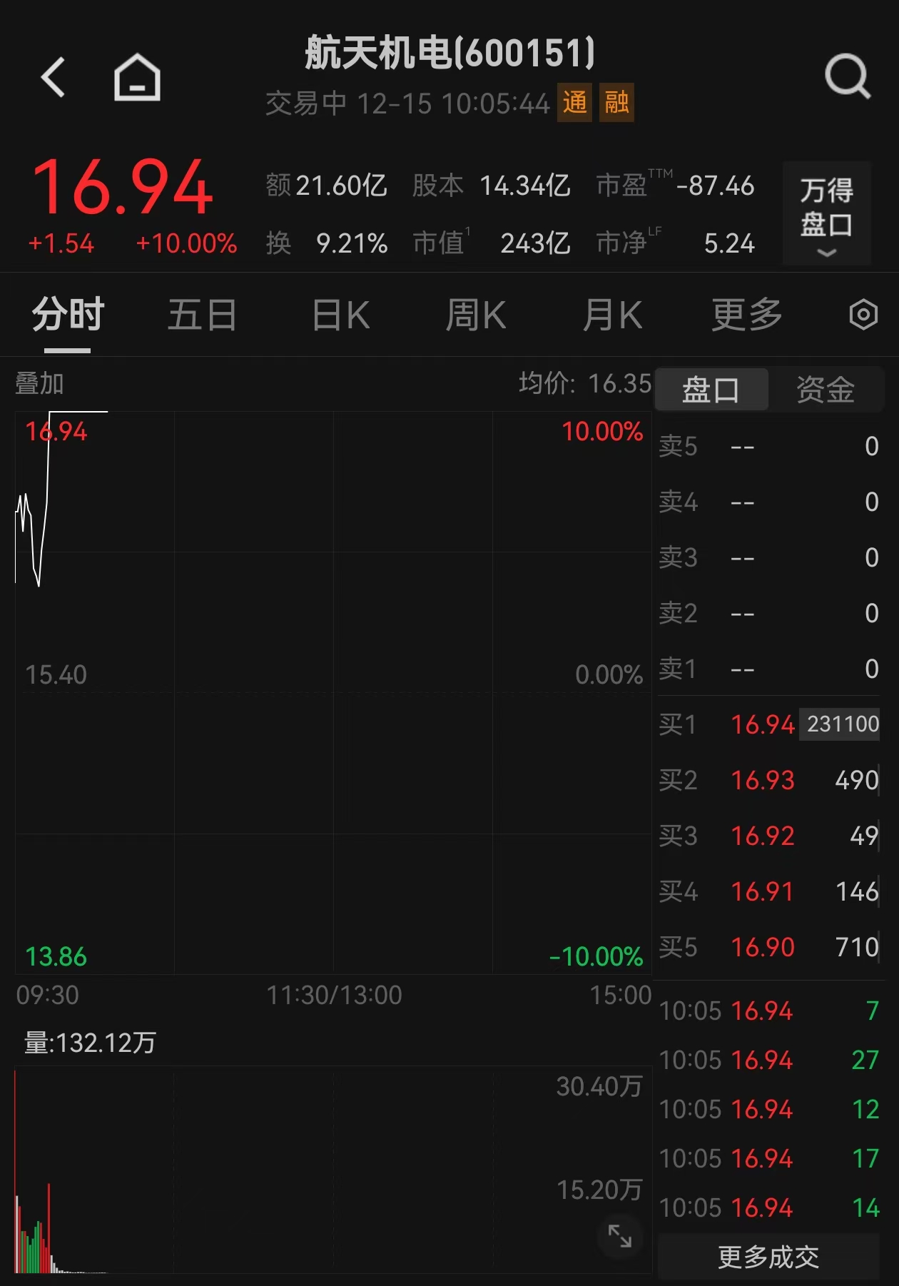 上证报中国证券网讯(记者于祥明)截至12月15日10时整,商业航天概念持续活跃,航天机电涨停。高华科技、航天电子、陕西华达、航天彩虹等多股上涨。