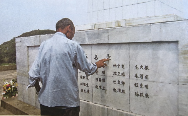在大鱼山战斗的烈士纪念碑前,李金根老英雄把战友们的名字逐一抚摸了一遍。
