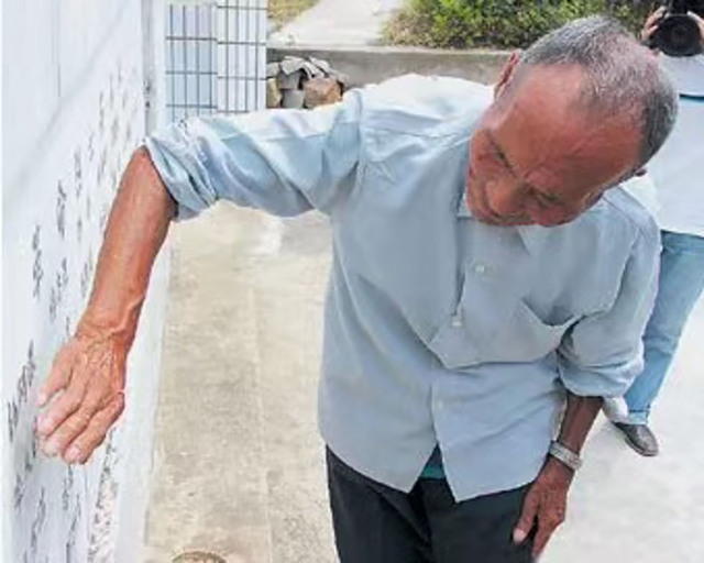 李金根老英雄抚摸纪念碑上烈士的名字(摄影林通屿)