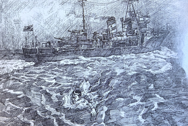 一下子,我感觉左臂一阵麻木,很快是剧烈的疼痛,我的左臂中弹了。幸运的是,我的落水点在船尾螺旋桨的右侧,转动的水流,将我卷到大海的深处,避开了更多的子弹。