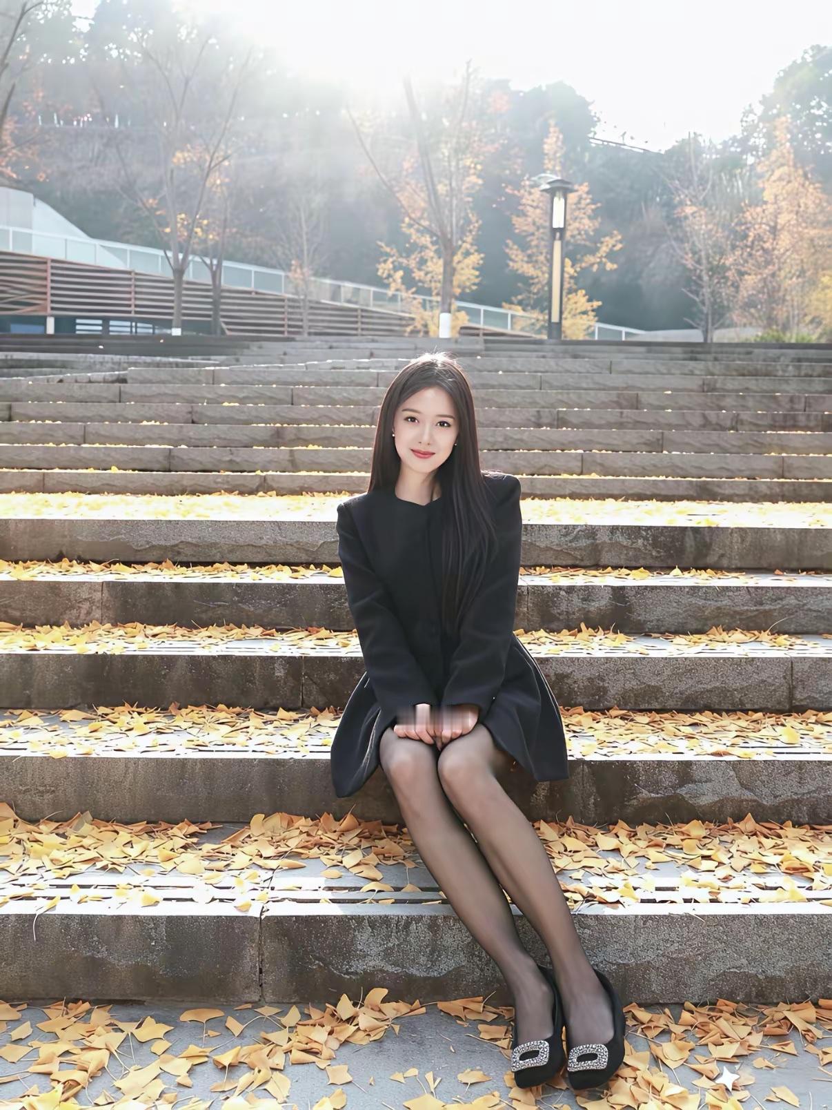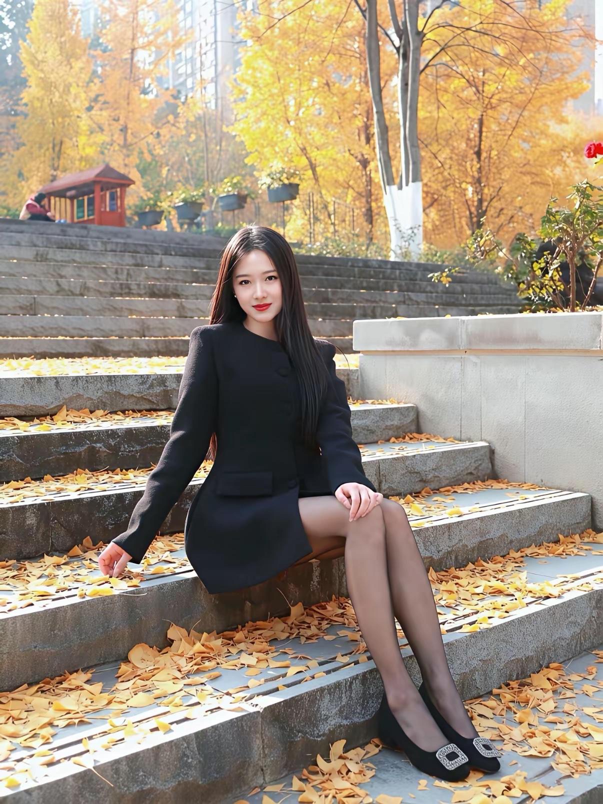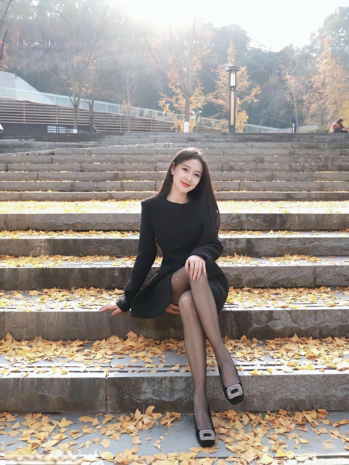 秋日暖阳下,黑裙少女坐台阶,落叶铺满地,静谧如画。