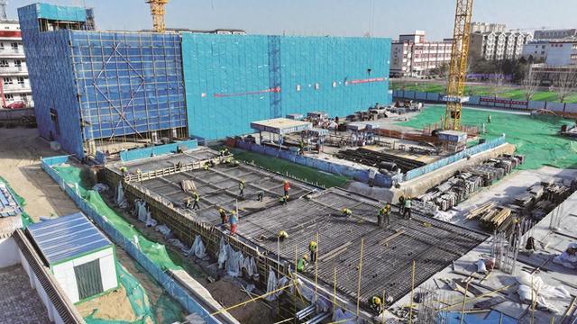 12月14日,银川市第十八中学扩建项目施工现场,工人们正紧锣密鼓地施工。目前,10号综合楼已封顶,11号实验楼正在加紧建设中,预计2026年7月交付使用。