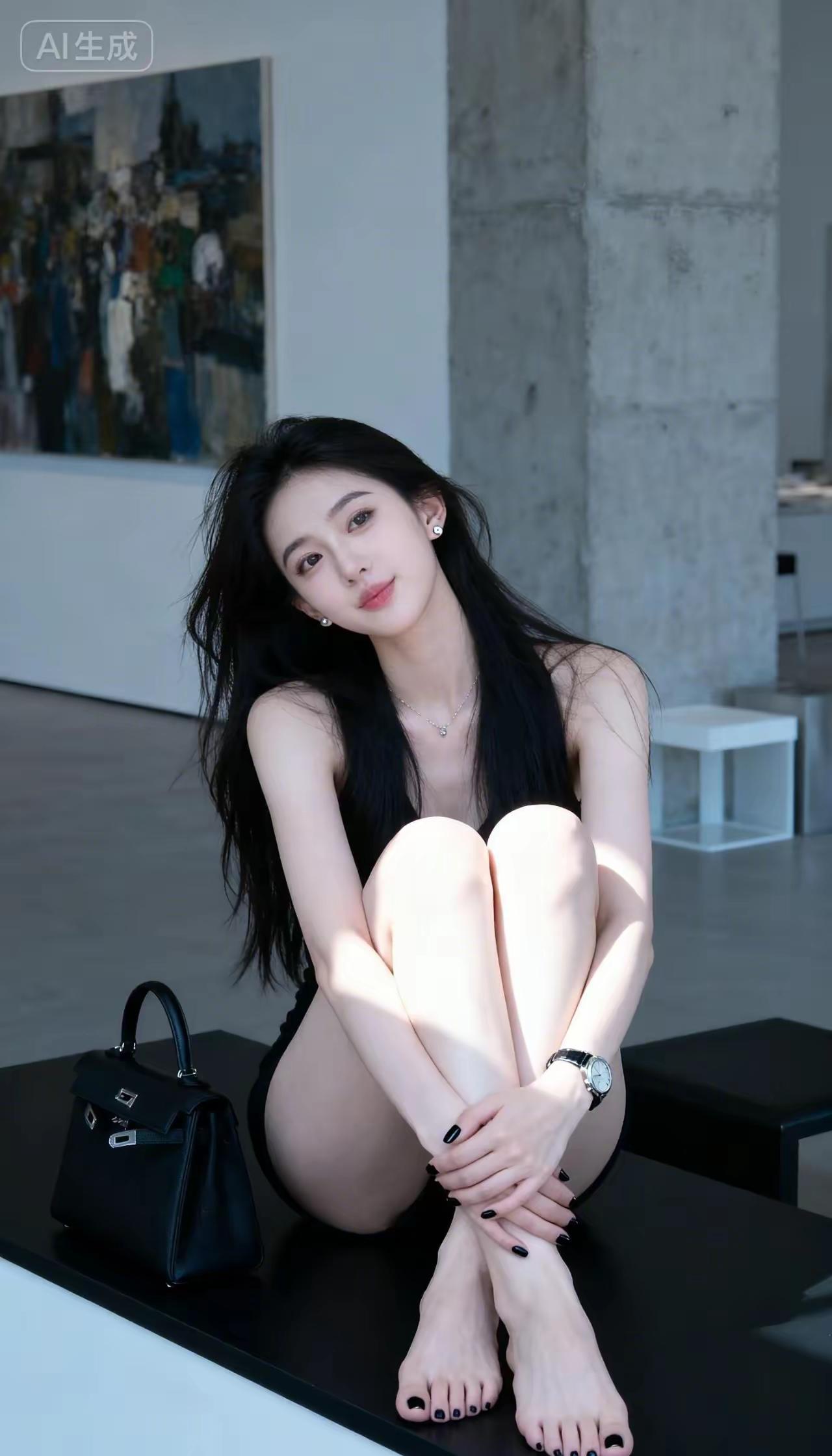 阳光洒进艺术馆,那画面美得像一幅油画。黑发少女轻倚长凳,双腿交叉,身着棕色连衣裙