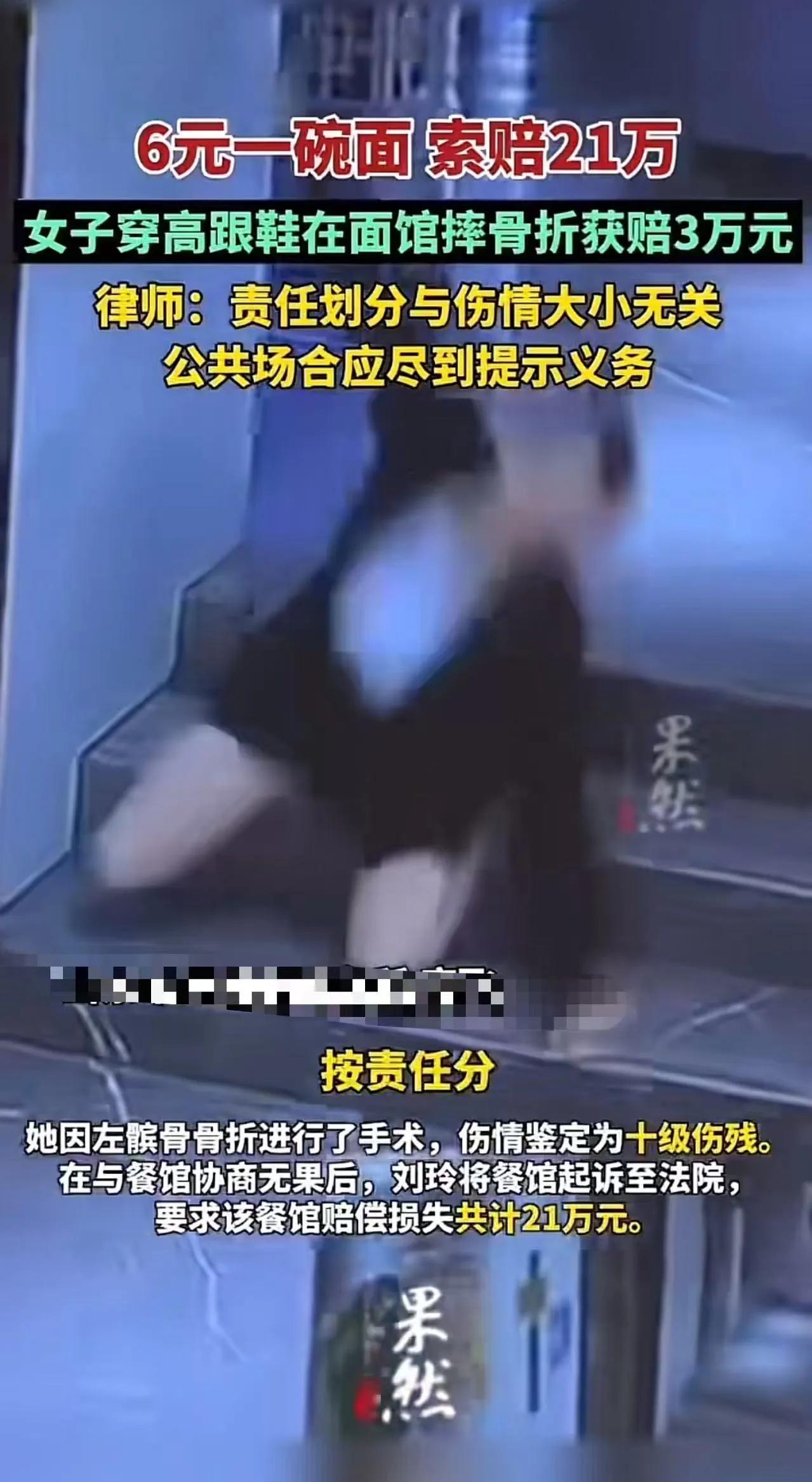 “小心台阶”“小心,雨天路滑”这些安全提示我们司空见惯,但不能只停留在表面上,更要在心里形成一道防护网,才能更好的保护自己,因为安全无小事。就有这样的一位女子 ,因为自己一时的疏忽,不仅给自己造成了伤害,还给别人带来了不必要的麻烦。在湖南岳阳,一位女子穿着高跟鞋,在面馆吃了一碗6元钱的面,走到门口𨄮了一跤,导致骨折,她认为店家没有尽到安全提示的责任,起诉店家赔偿 21 万!店家觉得很委屈,说:“你自己穿高跟鞋没走好,怎么能怨我们呢?”可法院判决店家赔偿 3 万!网友:如果我在法院摔了,有赔偿吗? 这起看似普通的“摔倒索赔案”,却像是一面镜子,折射出我们对“责任”、对“权益”以及“法律”认知的深层次思考。却也揭示了一个现实:在这个“权益至上的时代”,我们每个人都在不断寻找“公平”的边界。 法院判决店家只赔偿3万元。这一结果,似乎让很多人感到意外:为什么赔偿会这么少?难道法律就这么“宽容”?其实,这背后隐藏的,是对责任界限的理性划分。法院并没有全盘否定店家的责任,但也没有让女子一味“索赔到底”。判决体现了法律的公平——责任应当合理划分,不能一味“索赔”或“推责”。 这也引发了一个有趣的网友反思:如果我在类似场景中摔倒,是不是也能得到赔偿?答案显然不是“随便”就能拿到赔偿。法律讲究“合理责任”,而不是“无底线索赔”。每个人都应该懂得:责任,是要有证据、有合理依据的。盲目索赔,只会让法律变得荒谬,也会伤害到真正需要帮助的人。 更深层次地看,这起案件折射出我们对“权益保护”的期待与现实的差距。很多人觉得,遇到不公平就该“讨回公道”,但现实中,法律的天平是需要证据、责任和合理的界限的。我们不能只盯着“赔偿金额”,更要关注“责任的合理划分”。 这也提醒我们:在生活中,遇到问题不要盲目“求赔”,而是要理性面对,懂得用法律的武器保护自己,也要明白“责任”不是一纸空谈,而是有章可循的规则。每个人都应成为法律的守护者,用理性去维护权益,而不是一味追求“高额赔偿”。 这场“面馆摔倒案”,不仅仅是一场法律判决,更是一堂关于责任与权益的生动课。我们都希望生活更公平,但更希望的是,法律能成为我们最坚实的后盾,而不是一场“任人宰割”的游戏。毕竟,真正的公平,是在理性与责任之间找到平衡点。