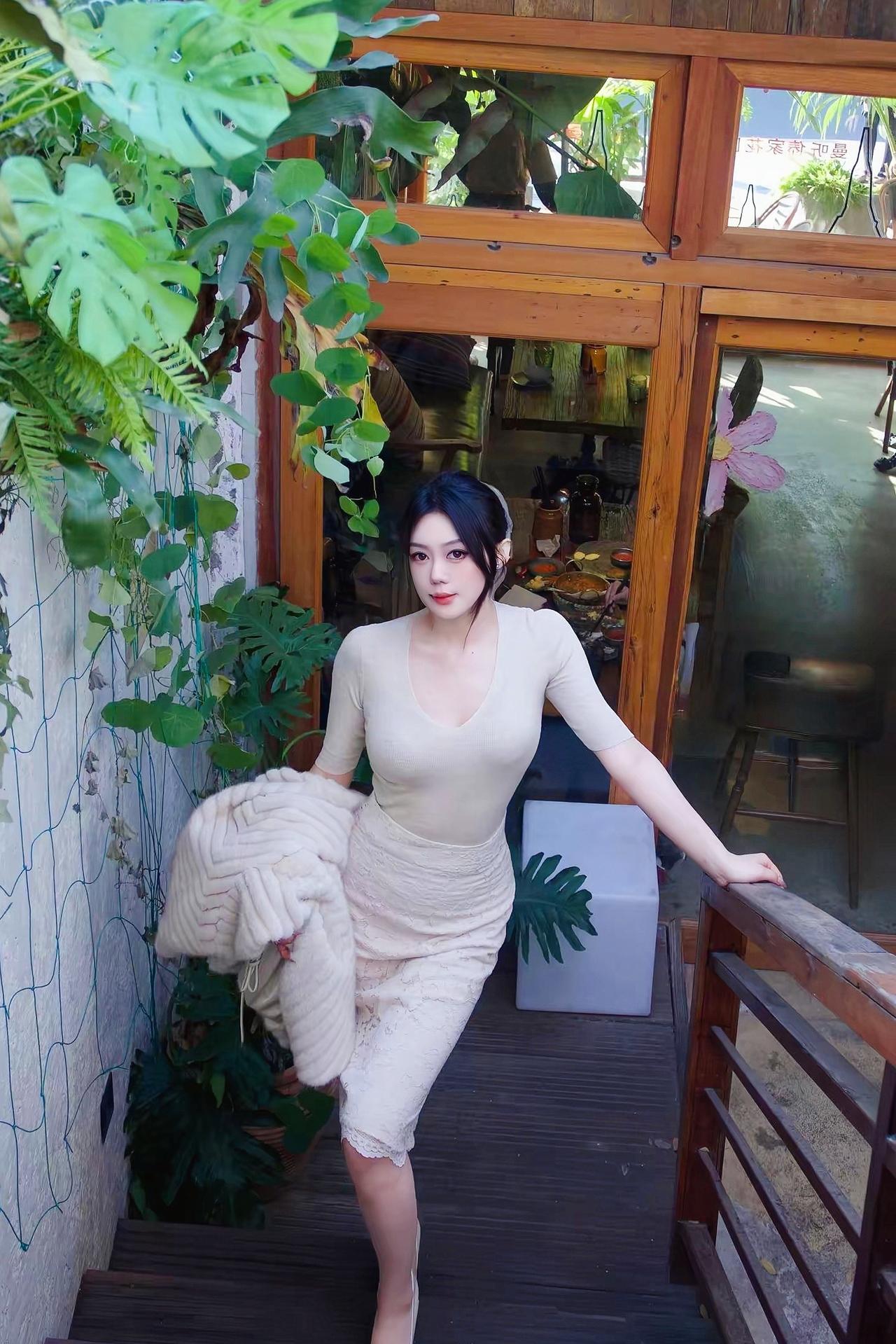 《亭畔旗袍》原创诗词原创看图片配诗丹衣缠颈缀花浓,团扇轻摇亭下风。石