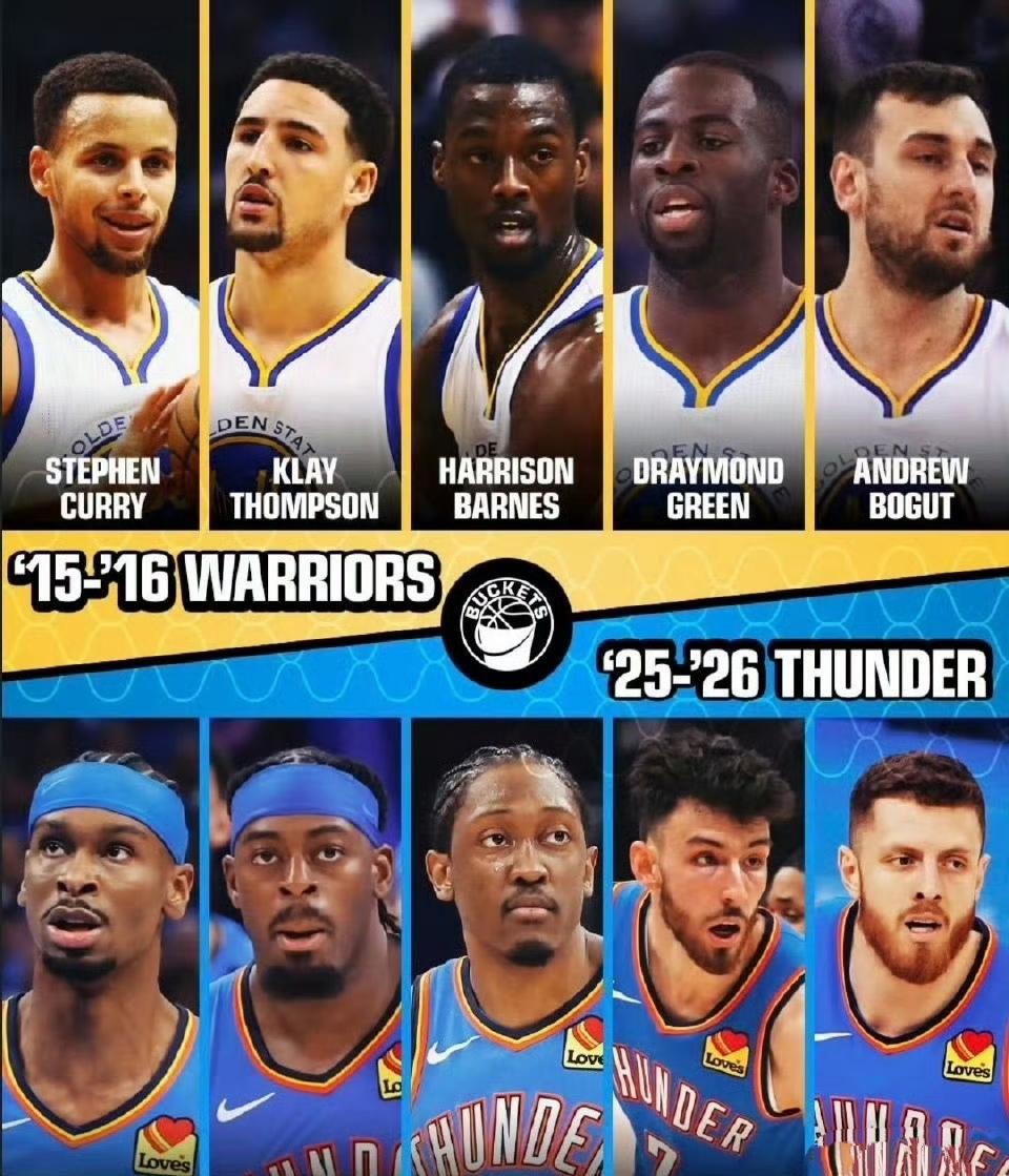美媒开始对比了,2016年勇士VS现在的雷霆,哪个更强? 已知勇士是2015年冠军,2016年73胜总亚军。 现在雷霆是2015年总冠军,2026年成绩还没出来呢。 如果明年雷霆夺冠,就是雷霆更强。 没有的话,我认为还是勇士王朝。[偷笑]