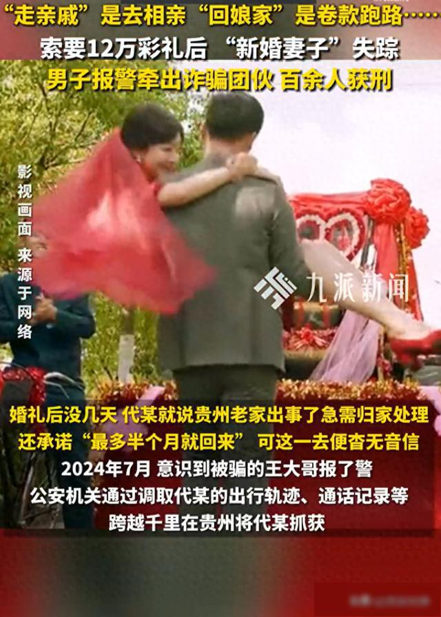 12月12日,九派新闻从检察日报获悉:2024年初,王大哥在短视频平台上偶然间刷到代某的征友视频,便添加其微信,两人很快聊得热火朝天。相识仅一个月,代某就主动提出想和王大哥结婚,随后两人见面,代某以老家习俗为由,向王大哥索要了12万元彩礼和3万元其他费用。同年4月,两人按照农村习俗举办了婚礼。婚礼后没几天,代某就说贵州老家出事了急需归家处理,可这一去便杳无音信。2024年7月,意识到被骗的王大哥报了警,公安机关通过调取代某的出行轨迹、通话记录等,跨越千里在贵州将代某抓获。代某交代,她是被一个叫“潘哥”的人骗到一个窝点后,被迫参与诈骗的,事后还要将大部分赃款上交,自己只能得到少量提成。