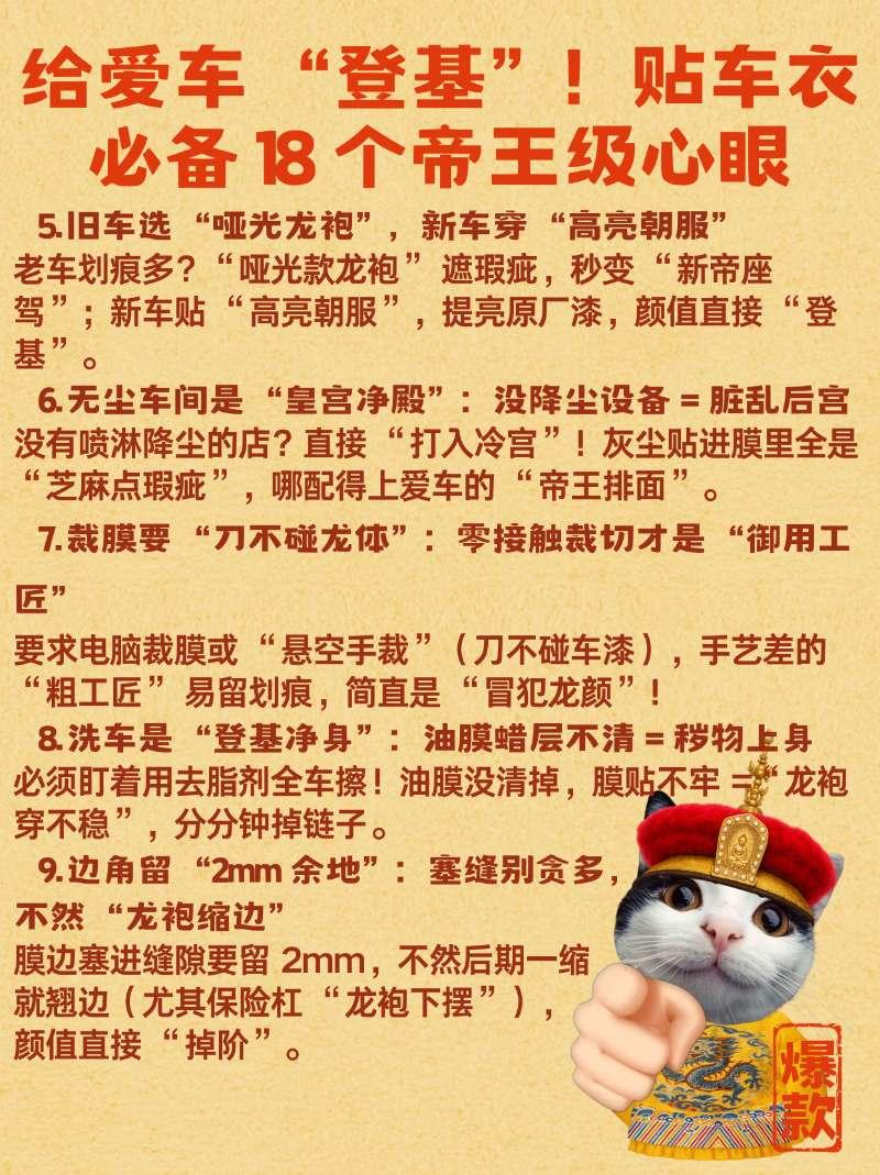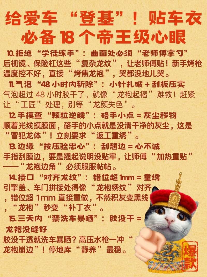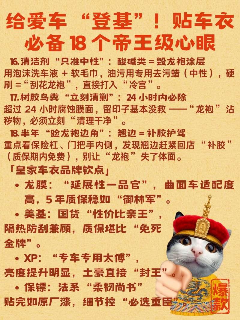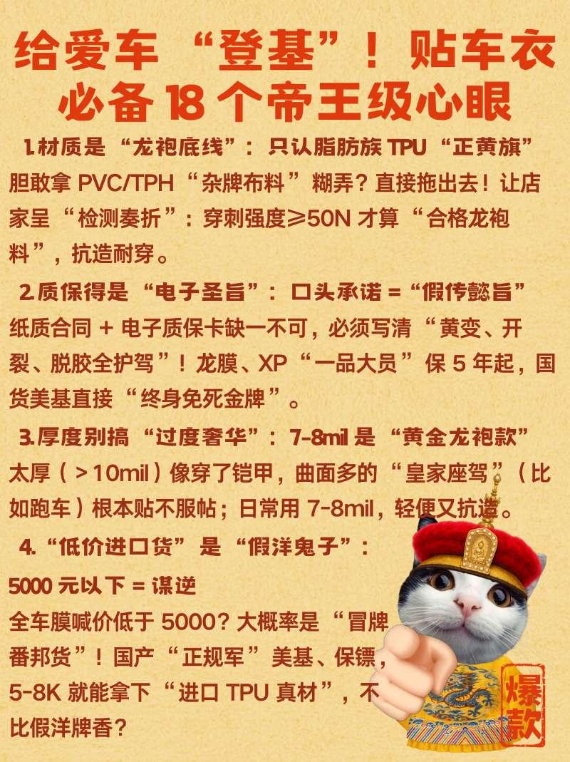 贴车衣的 “皇帝级心眼”:这 18 招,把店家拿捏得明明白白贴车衣就像给爱车 “登基加冕”,没点 “帝王级心眼”,分分钟被店家当 “软柿子” 捏!这 18 条 “御膜圣旨”,照着办保你爱车稳坐 “颜值龙椅”👇【来自懂车帝车友圈】