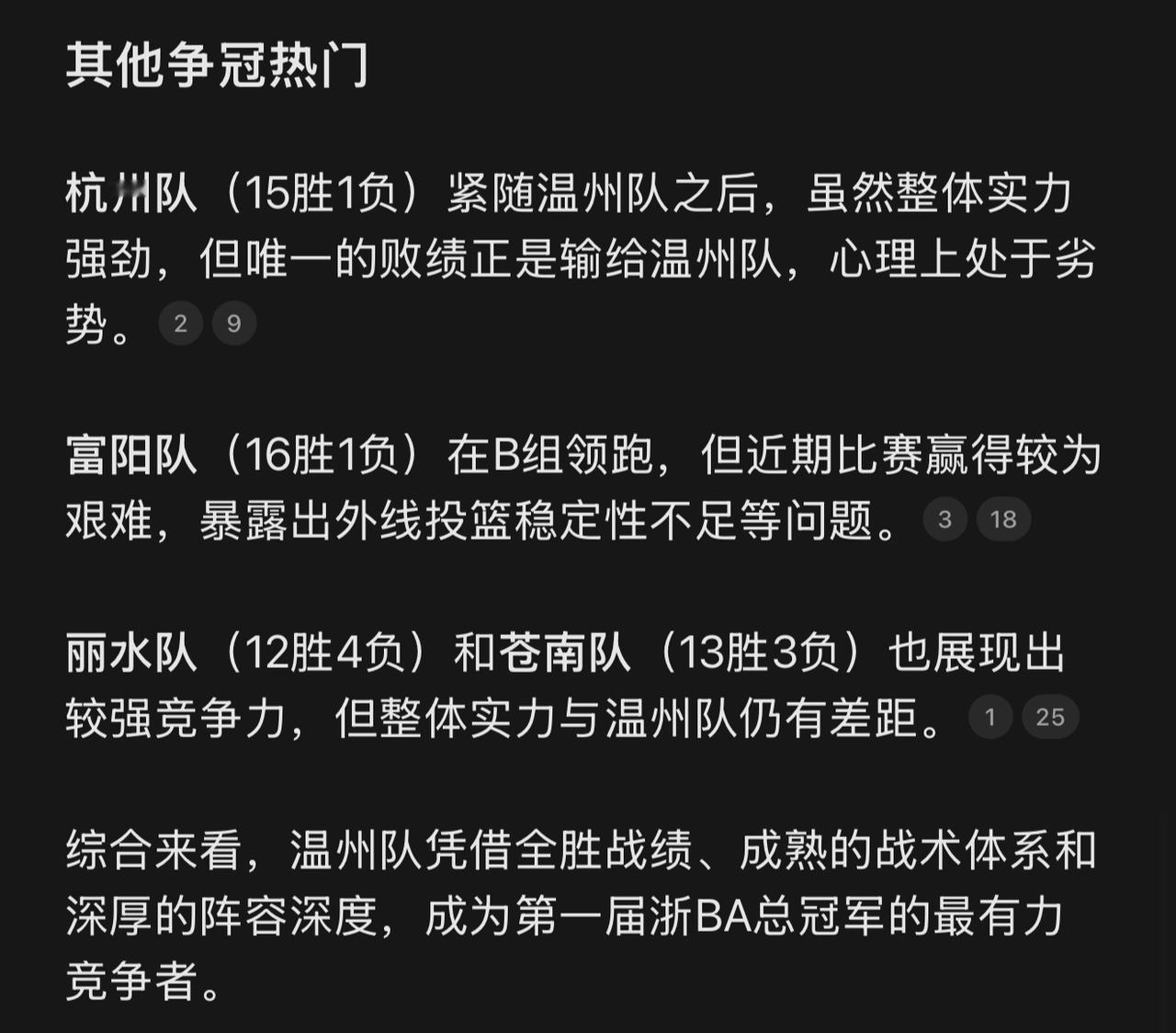 Ai预测出了浙BA的决赛排名,也不是没有道理! 他认为第一名还是温州队,剩余球队中,杭州队,富阳队和丽水也都有机会去争夺冠军,这说实话,它的预测就有点呆了,完全是根据现有的战绩来进行预测的,并没有考虑到实际比赛过程中的突发性! 我还是觉得总冠军应该还是温州和杭州,或者温州和富阳队,因为下半赛区杭州队和富阳队分在一起,所以两个队只有一个能出线,去和温州队竞争总冠军名额! 呼声比较高的丽水和台州,打进最终的四强或者六强还是可以的,但是总决赛还是差点水平,就好像丽水打其他球队都轻轻松松,但是两次都打不过富阳队,而丽水打温州肯定更难打了! 个人预测冠军温州队(60%),杭州队(25%),富阳队(15%)!浙BA赛况 浙BA城市联赛