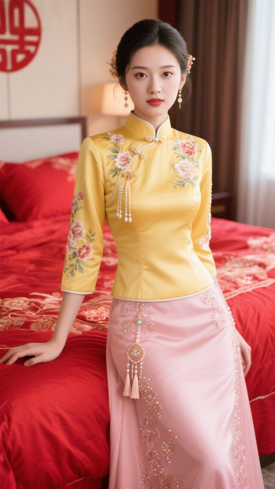 《明黄里的素雅》 朱红帐幔漫开暖意时,明黄旗袍上的素净绣花粉得含蓄,似沾了晨露的雅致。盘发间坠着的金饰轻晃,与襟口的珍珠流苏相触,漾出细碎的柔光——将春日的清婉,细细缝进缎面的肌理里。 衬裙的粉若隐若现,如晨雾里初绽的桃花。裙摆银线绣着流云纹,亮得克制,像把月光揉进了褶皱。耳坠的珠串随呼吸微颤,连空气都染上了轻柔的温软。 这并非刻意的雕琢,是东方美学里的妥帖:一针一线纳的是端正,一珠一饰缀的是自持。站在红黄交织的韵致里,时光也凝成了一帧静美的旧画。 中式美学穿搭 旗袍氛围感