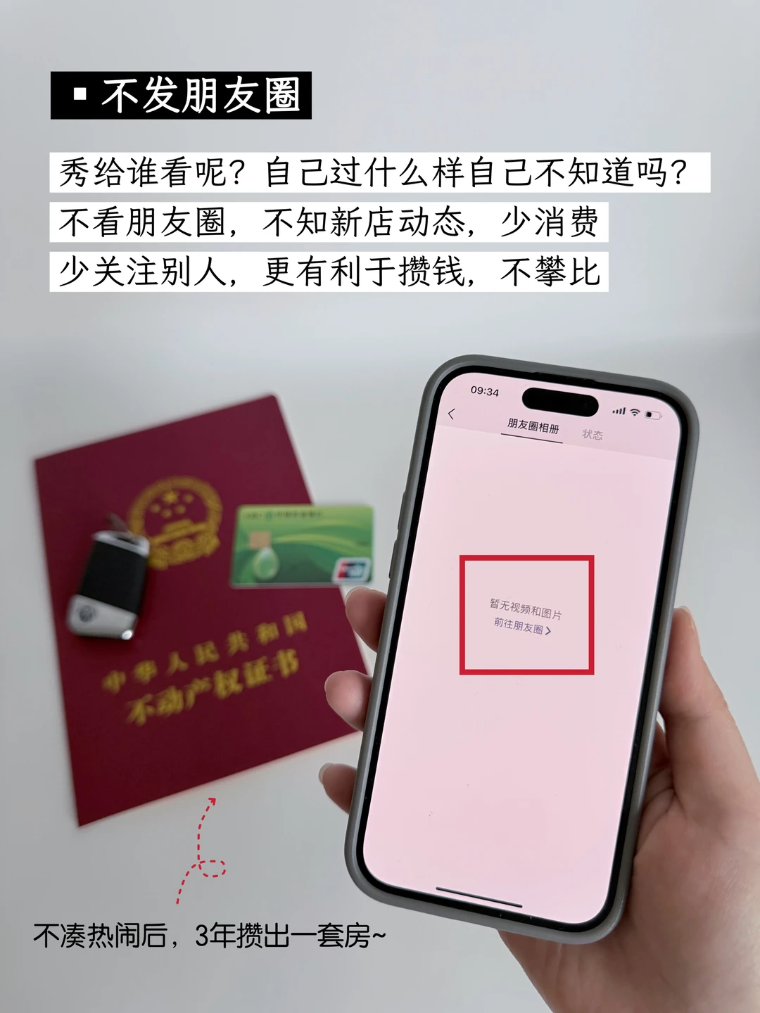 秀给谁看呢?自己过什么样自己不知道吗?不看朋友圈,不知新店动态,少消费;少关注别人,更有利于攒钱,不攀比。