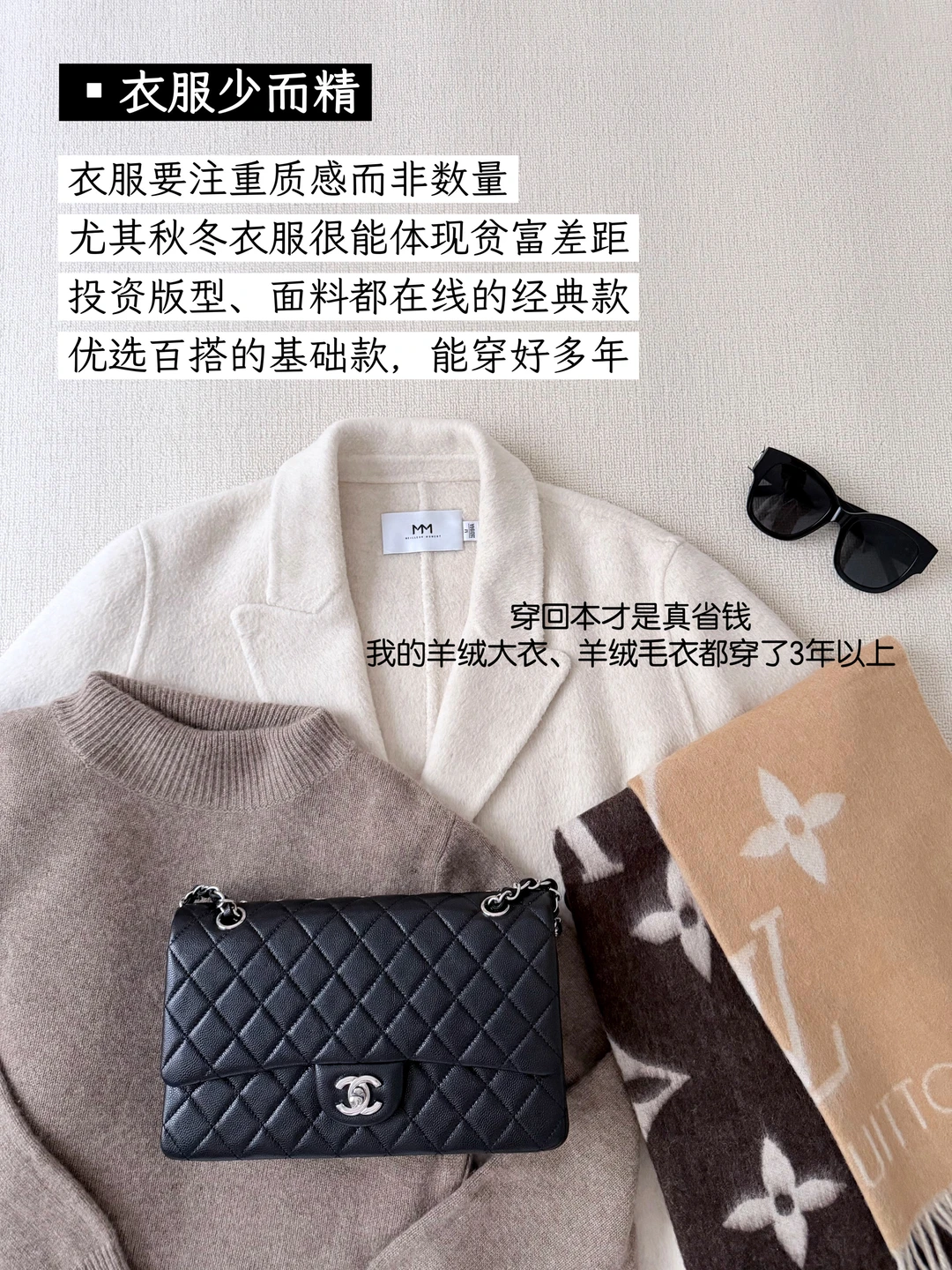 衣服要注重质感而非数量,尤其秋冬衣服很能体现贫富差距,投资版型、面料都在线的经典款。优选百搭的基础款,能穿好多年