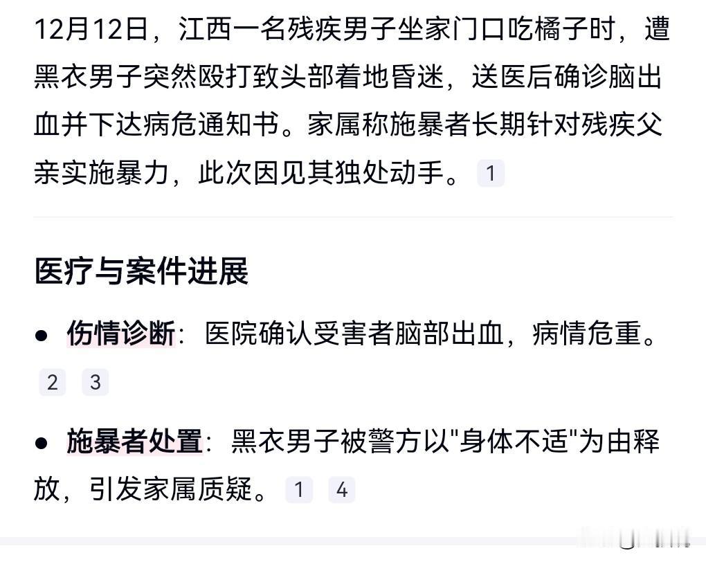 这真的是太丧心病狂了。 男子坐门口吃橘子被黑衣男打倒昏迷。 被打到下了病危通知书。 想不到那一下的威力竟然这么大。 令人感到不解的是,警方竟然以“身体不适”为由将黑衣男放出来了。 这一定要给大家一个交代。 彻查此事。