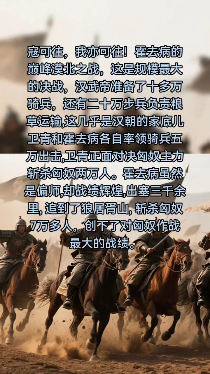 寇可往,我亦可往!霍去病的巅峰漠北之战,这是规模最大的决战。汉武帝准备了十多万骑兵,还有二十万步兵负责粮草运输,这几乎是汉朝的家底儿。卫青和霍去病各自率领骑兵五万出击,卫青正面对决匈奴主力,斩杀匈奴两万人。霍去病虽然是偏师,却战绩辉煌,出塞三千余里,追到了狼居胥山,斩杀匈奴7万多人,创下了对匈奴作战最大的战绩。