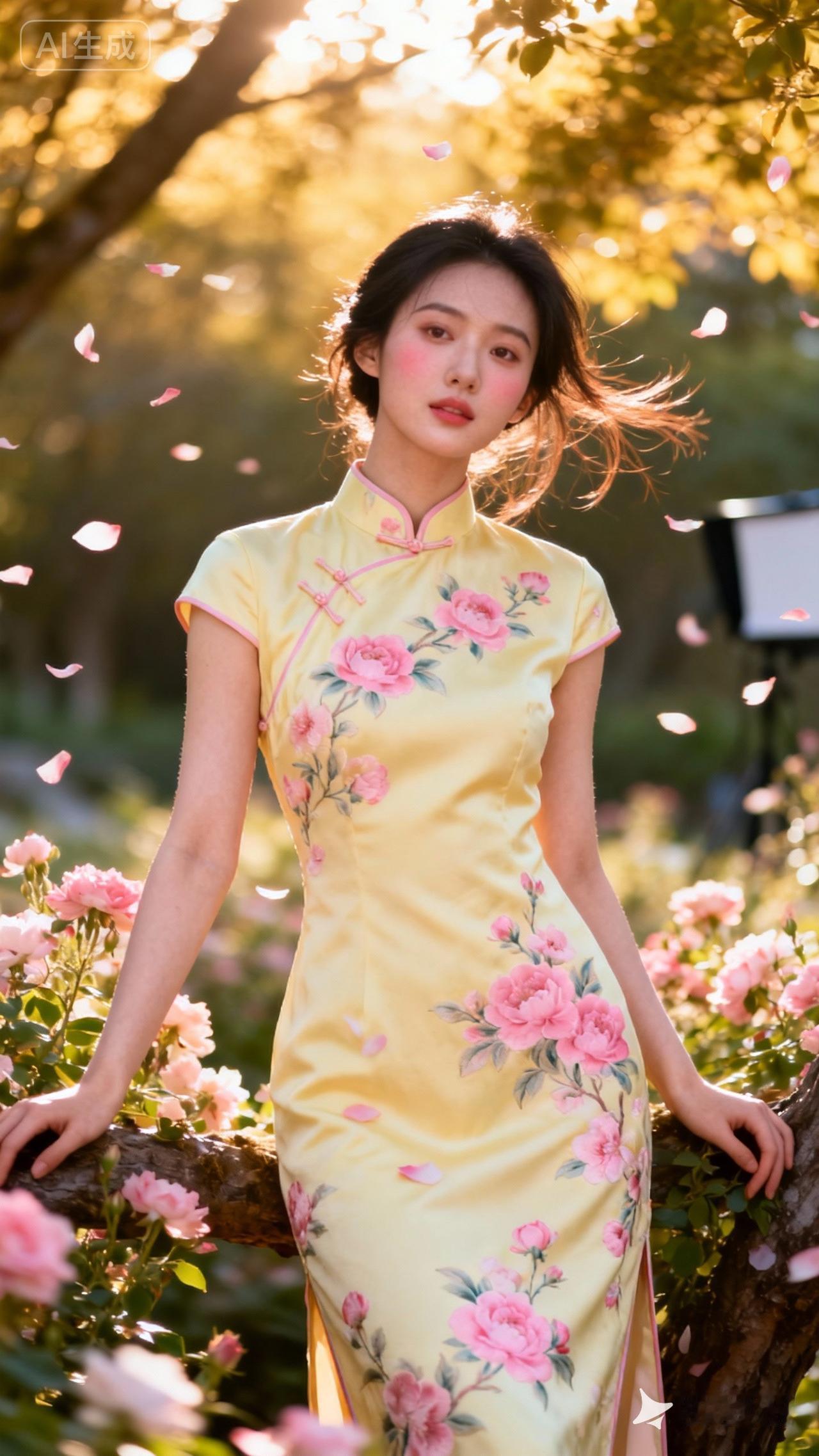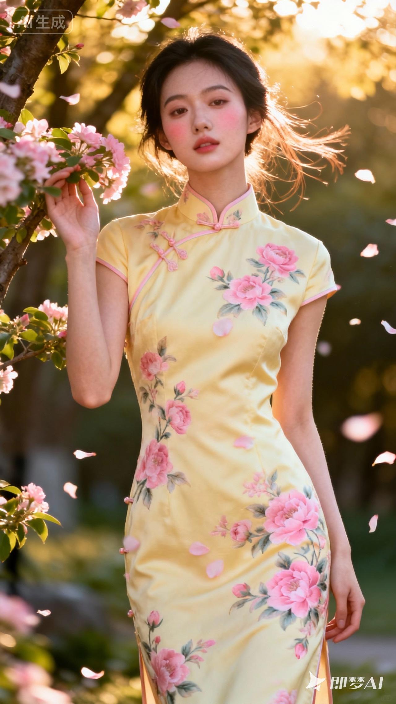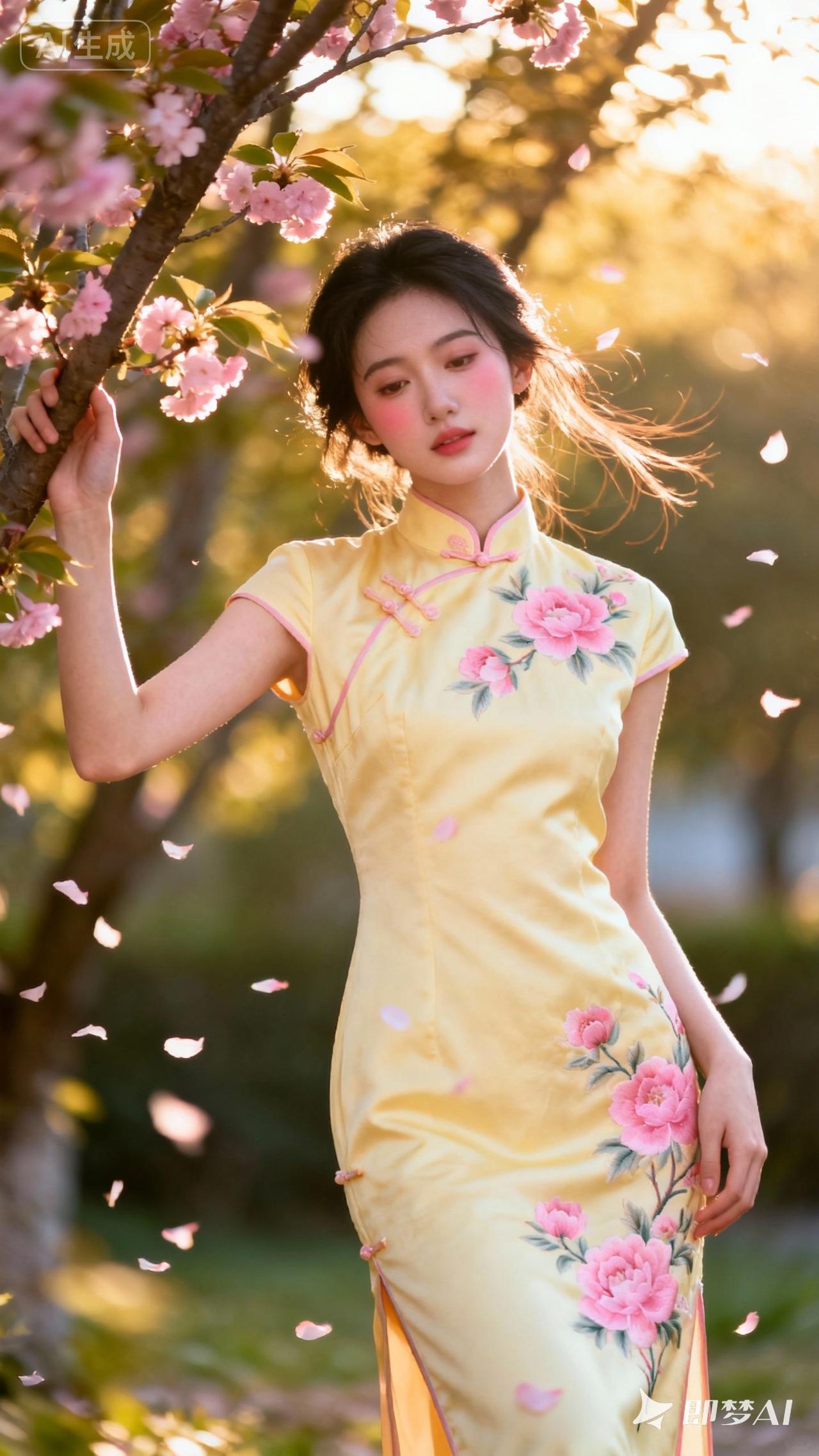 春日花海中的旗袍美人,粉嫩花瓣飘落,如梦如幻。