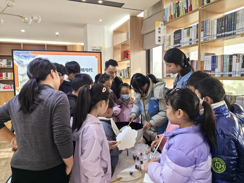 近日,弋江区马塘街道新兴社区春江书苑内暖意融融,“扇韵雅集·漆彩社区”手工漆扇活动在此热闹举行。与传统绘画不同,本次活动的漆扇创作以“水染”为特色——将颜料融入清水,再将空白素扇轻浸其中,让色彩在扇面上自然晕开。亲子家庭在安工程志愿者的指导下,体验这一独特非遗技艺。