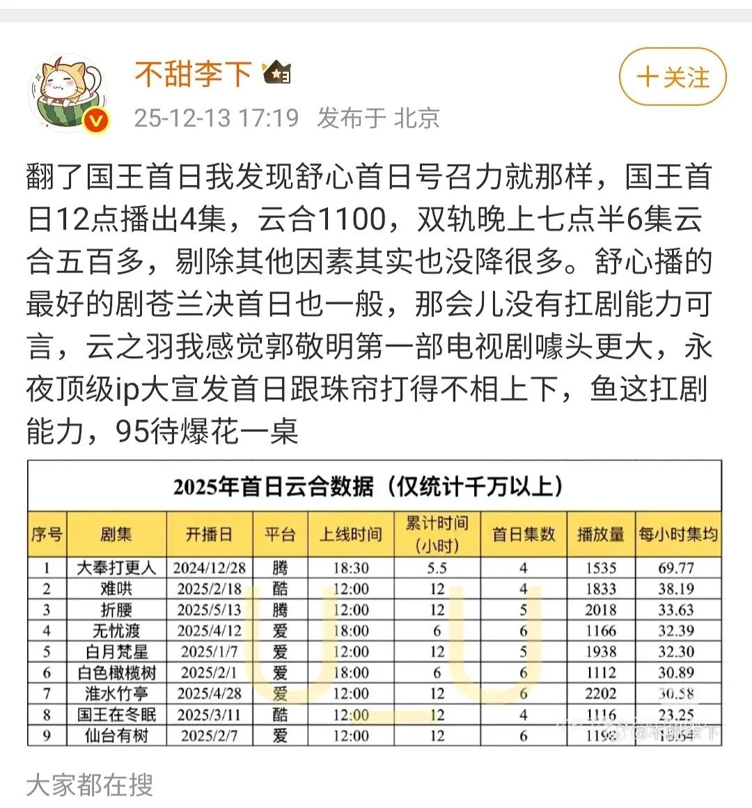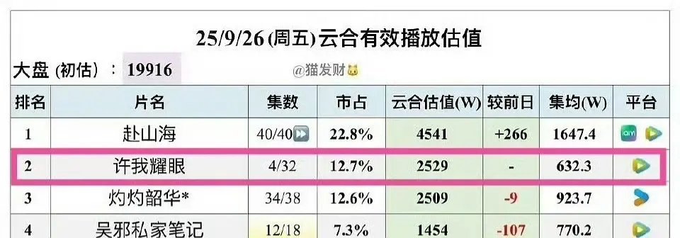 虞书欣所谓的”抗剧”比赵露思差太多双轨大营销,首日云合500多万,许我耀眼首日云合2500万,这是真空降