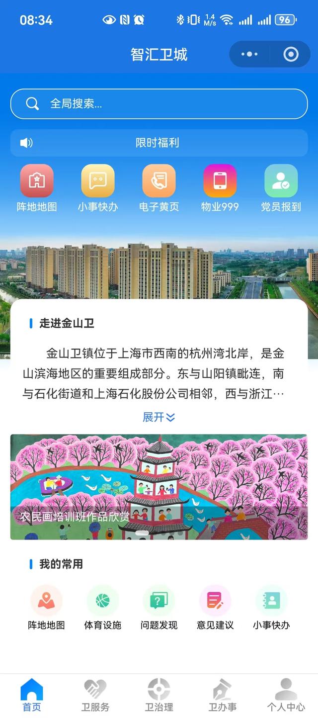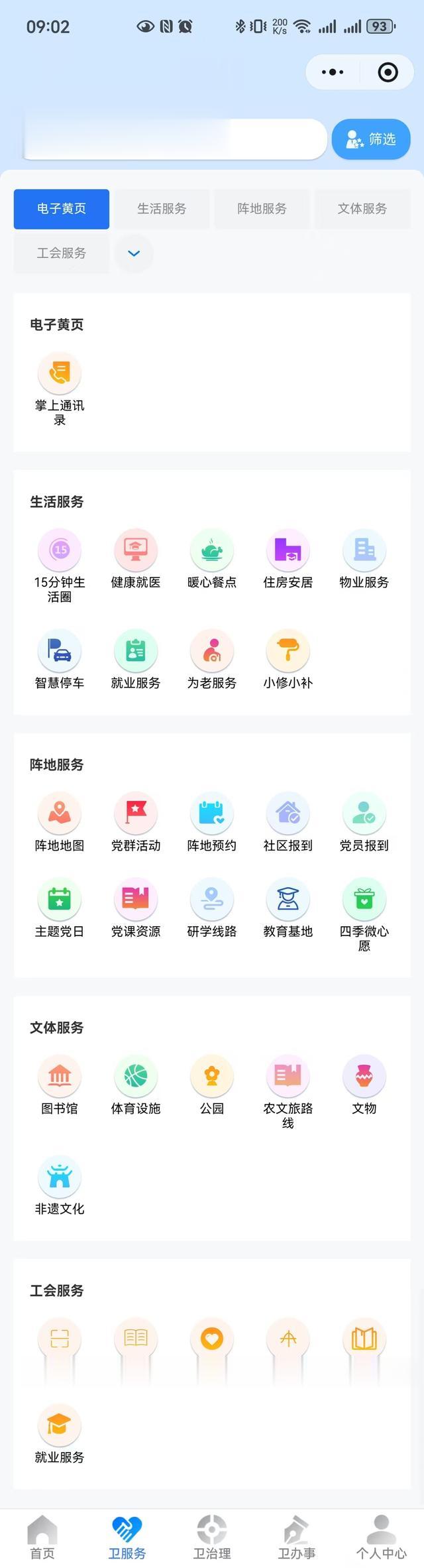 新版界面清晰简洁,设有“全局搜索”框,方便用户快速查找所需内容。首页还集中展示“阵地地图”“小事快办”“电子黄页”“物业999”“党员报到”五大常用功能,覆盖诉求反映、服务查询、热线对接等多种场景。下方则分为“卫服务”“卫治理”“卫办事”三大核心板块,共整合143项服务资源,构建起本地化、全场景的一站式服务体系。
