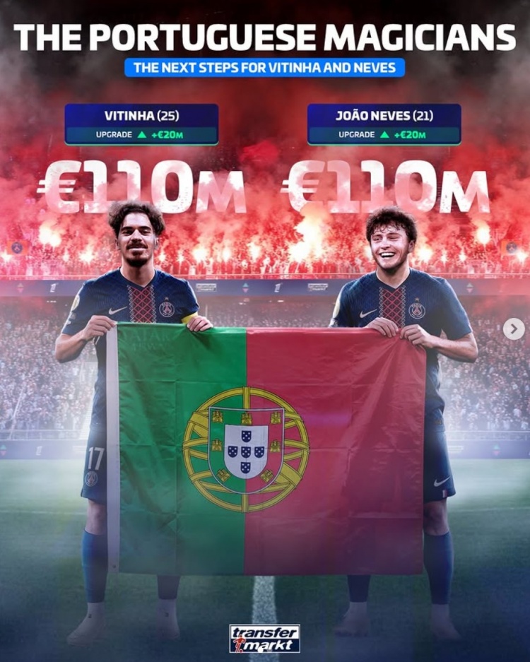 葡萄牙中场双核!25岁维蒂尼亚、21岁若昂·内维斯均达1.1亿欧
