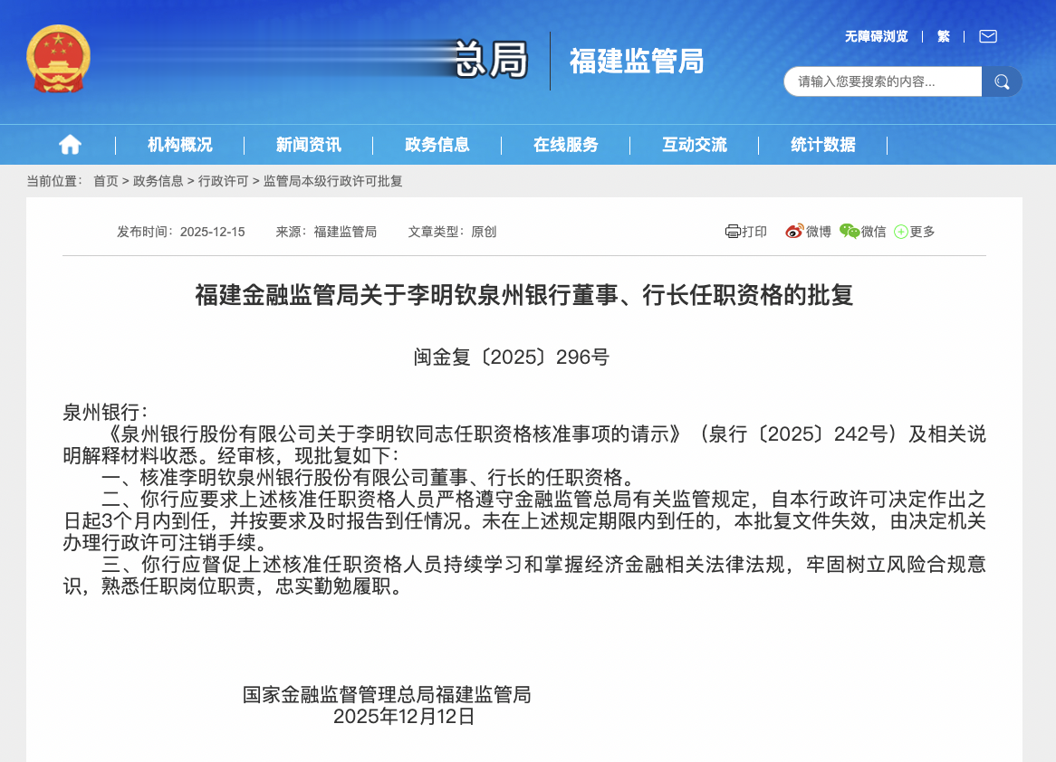 上证报中国证券网讯(记者黄坤)12月15日,福建金融监管局披露的批复显示,核准李明钦泉州银行股份有限公司董事、行长的任职资格。