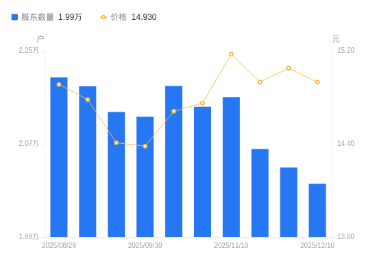 日期A股户数(户)流通A股户均持股数(股)户均持股市值(万元)2025-12-101992928051.6541.882025-11-282024427615.1641.562025-11-202060027137.9340.522025-11-102160125880.3439.262025-10-312141926100.2538.502025-10-202181825622.9437.612025-09-302122426340.0537.882025-09-192131626226.3737.792025-09-102181325628.8137.882025-08-292198425429.4637.92