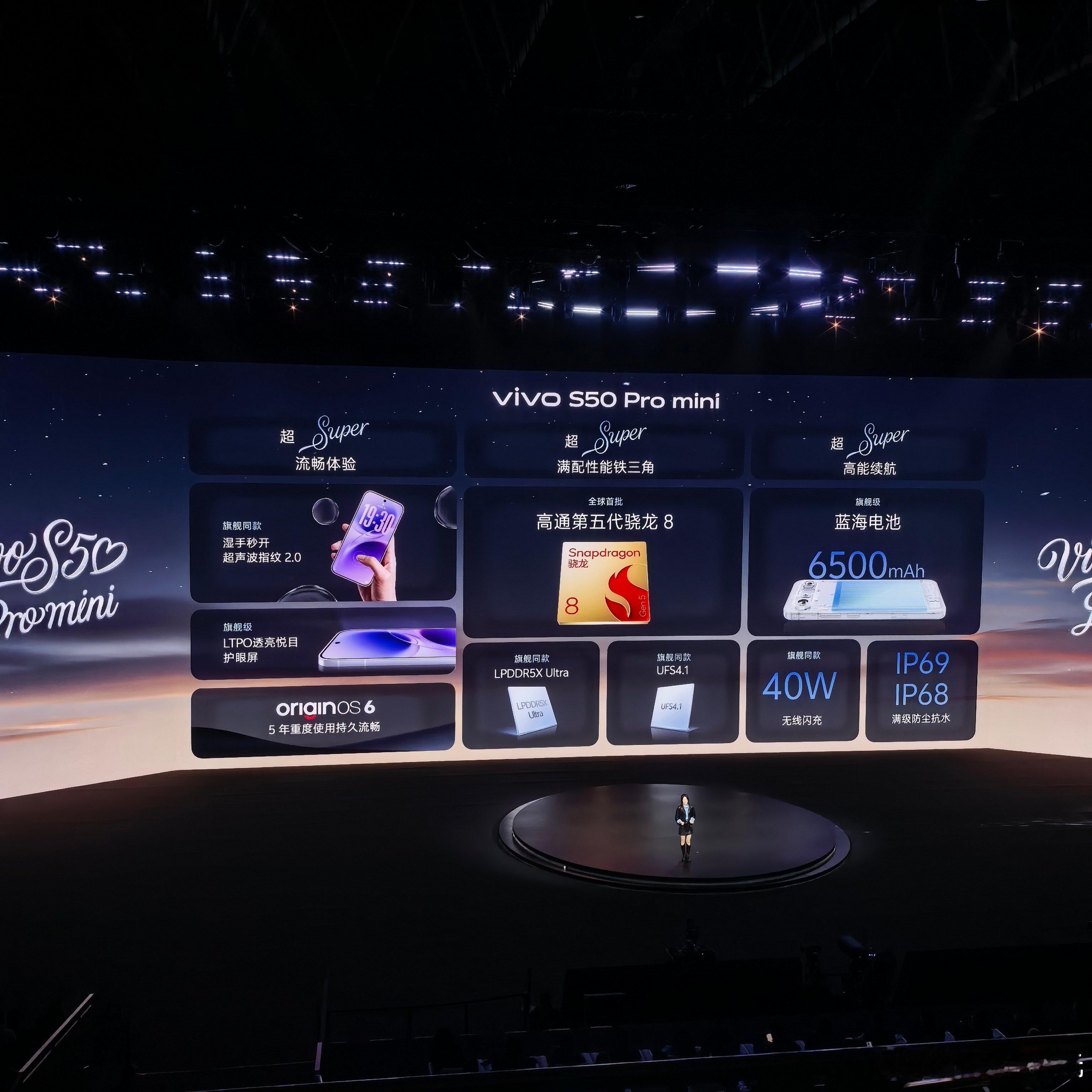 vivo S50 Pro mini正面搭载了6.31寸轻薄小直屏,悬浮水滴冷雕工艺镜组,手感超Super。性能上搭载全球⾸批搭载第五代骁龙8芯⽚,6500mAh蓝海电池搭配90W超快闪充,性能超Super。影像上,搭载同档领先的超感光仿生大底主摄、全焦段变焦闪光灯,搭配3种大师Live运镜、6大创意Live特效、N多胶片Live滤镜,Live玩出花,影像超Super!诚意满满的产品