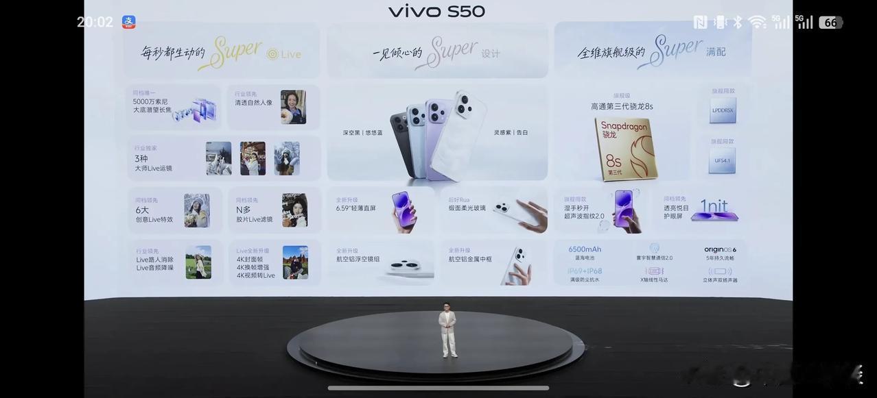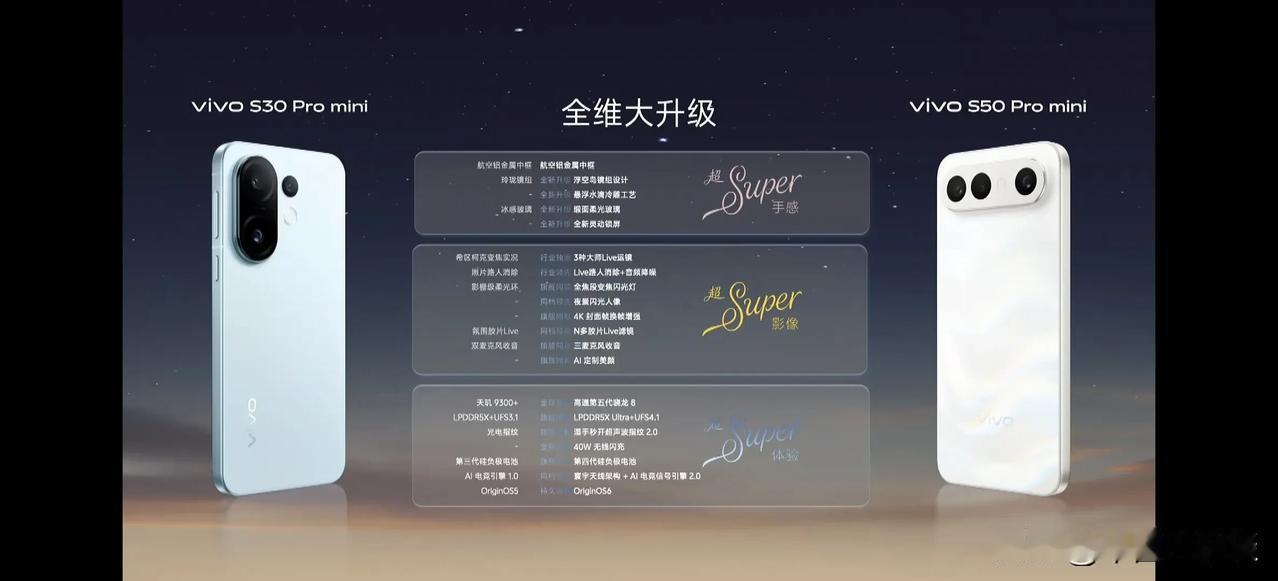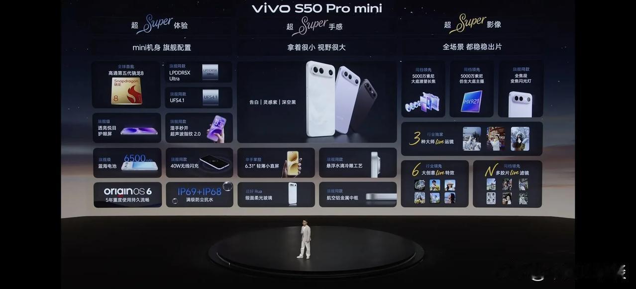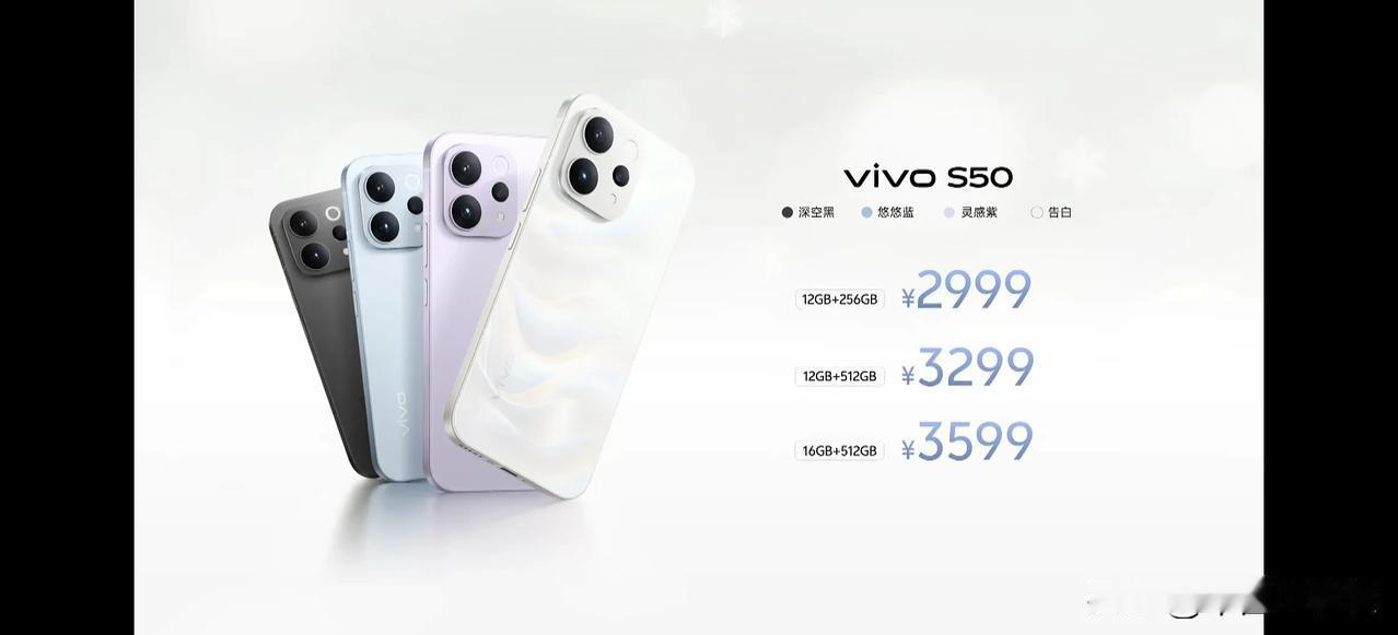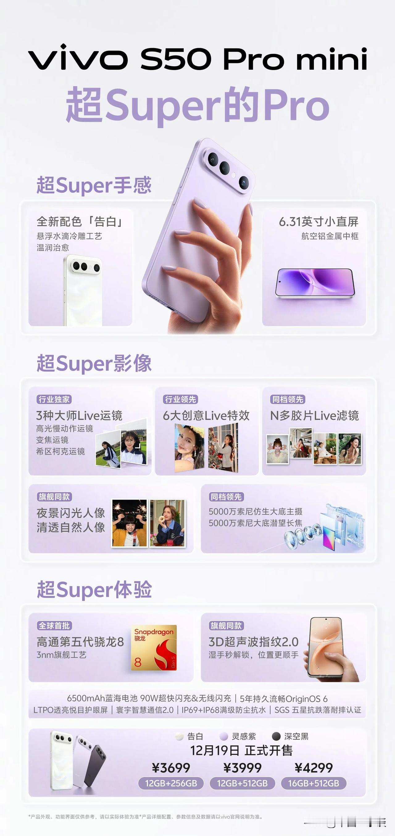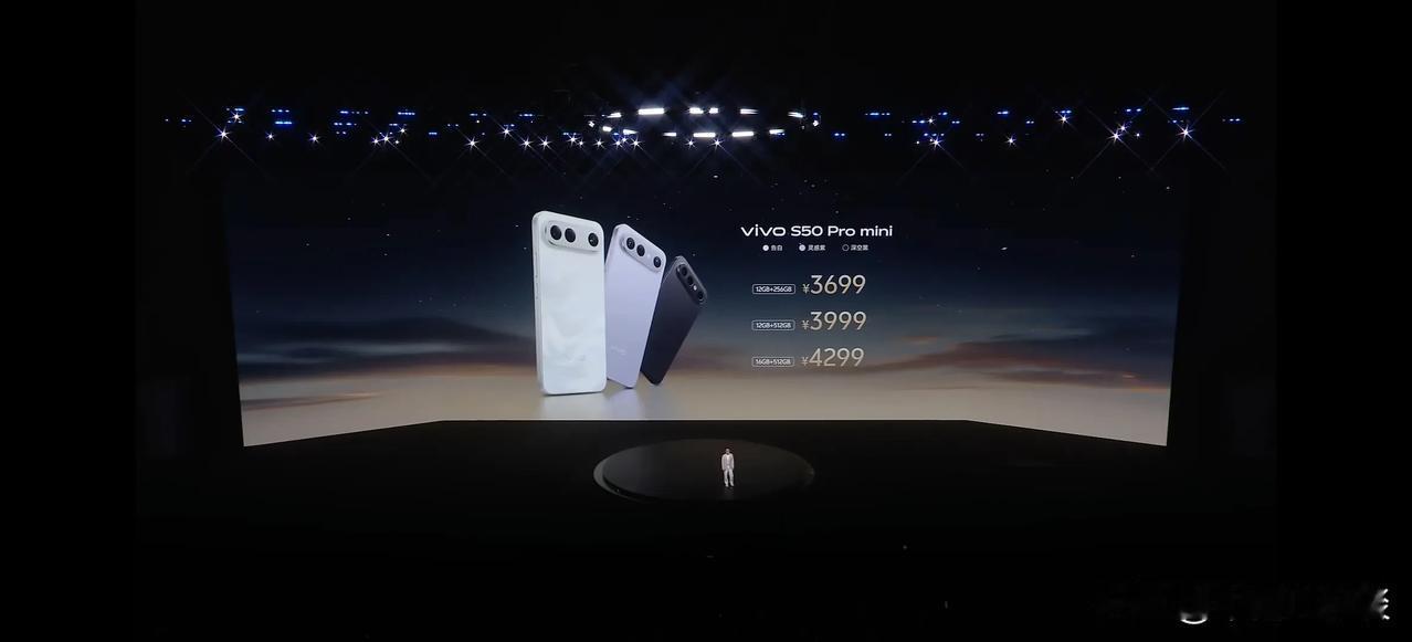 售价来了! vivo S50:四款配色,旗舰质感。同档唯一大底潜望长焦,三种行业独家大师Live运镜、六大Live特效和 N多Live滤镜。6500mAh蓝海电池,搭载第三代骁龙8s,超声指纹、护眼好屏、学生三件套,IP69+IP68防尘抗水、X轴线性马达、全功能NFC。 12+256G:2999 12+512G:3299 16+512G:3599 vivo S50 Pro mini:6.31" 轻薄小直屏,1:1均衡配重,悬浮水滴冷雕工艺镜组。6500mAh蓝海电池搭配90W超快闪充,全球⾸批搭载第五代骁龙8芯⽚,五年重度使⽤依然持久流畅。同档领先的超感光仿生大底主摄、全焦段变焦闪光灯,搭配3种大师Live运镜、6大创意Live特效、N多胶片Live滤镜。 12+256G:3699 12+512G:3999 16+512G:4299