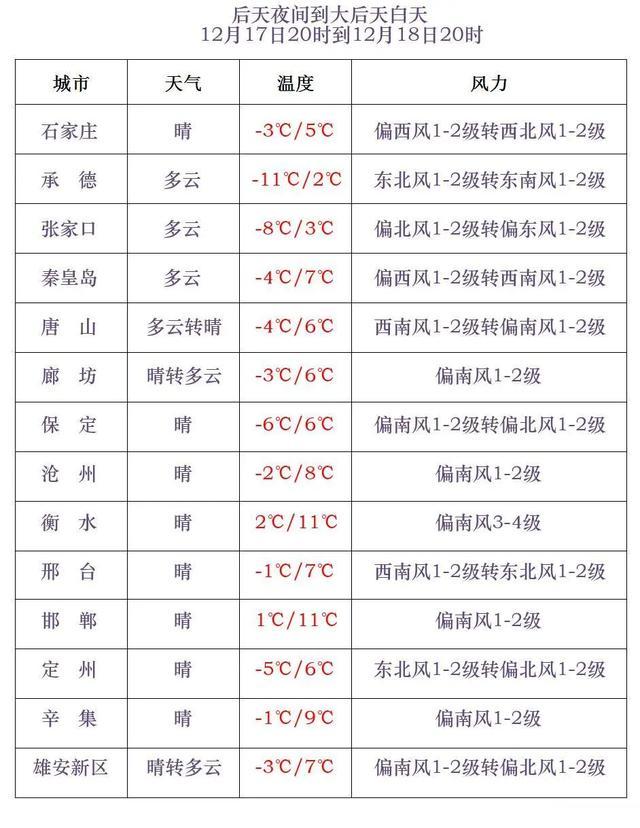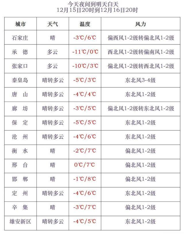 今天傍晚到夜间,张家口、承德晴转多云,其他地区晴间多云。最低气温,张家口中北部、承德-18~-9℃,其他地区-8~0℃。