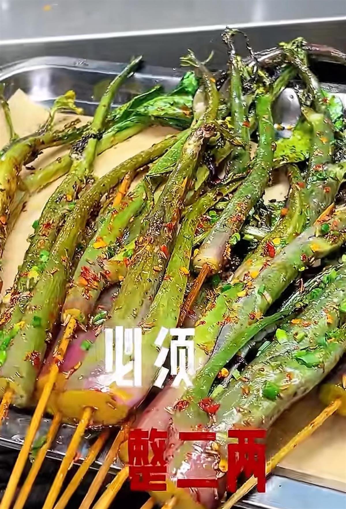 不同于清炒红菜薹对食材长度的包容,烤红菜薹在选材上更讲究——老板强调,会特意挑选根须更短、嫩茎更粗的红菜薹,大约“一根一串,每串20克左右”。“刷上酱汁、撒上辣椒面,吃起来反而有一种清甜感”,老板介绍,在正式推出前自己也试吃了,“现在平均每天能卖出3至5斤,不少顾客是看了视频专门来尝鲜的”。店内员工告诉记者,目前一串烤红菜薹的售价是2元。