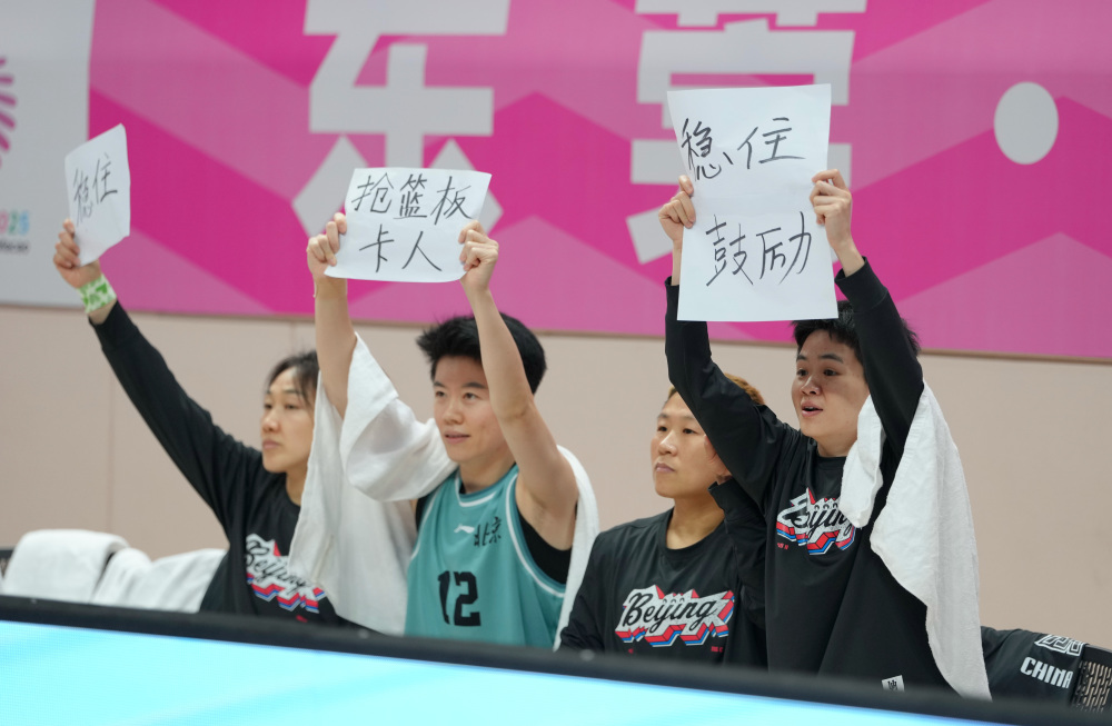 12月15日,北京队球员在场边举起提示场上队友的手写纸卡。新华社记者肖恩楠摄