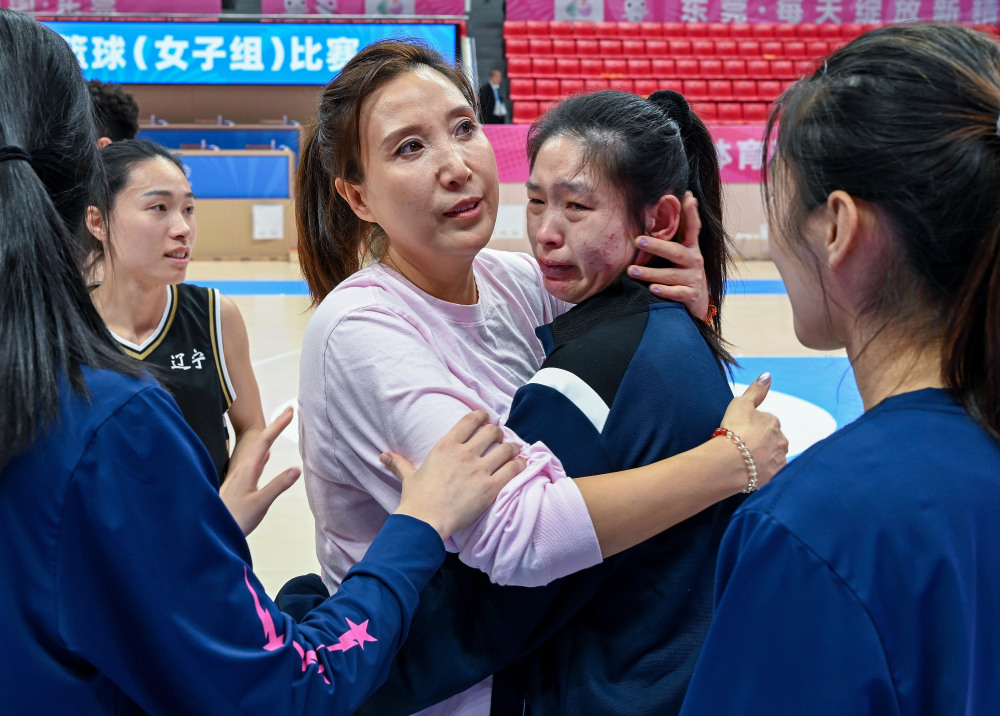 12月14日,在广东东莞举行的全国第十二届残疾人运动会暨第九届特殊奥林匹克运动会聋人篮球比赛女子组半决赛中,辽宁队88:65战胜广东一团队。辽宁队教练员夏丹(中)在比赛结束后拥抱落泪的队员陈铎。新华社记者肖恩楠摄