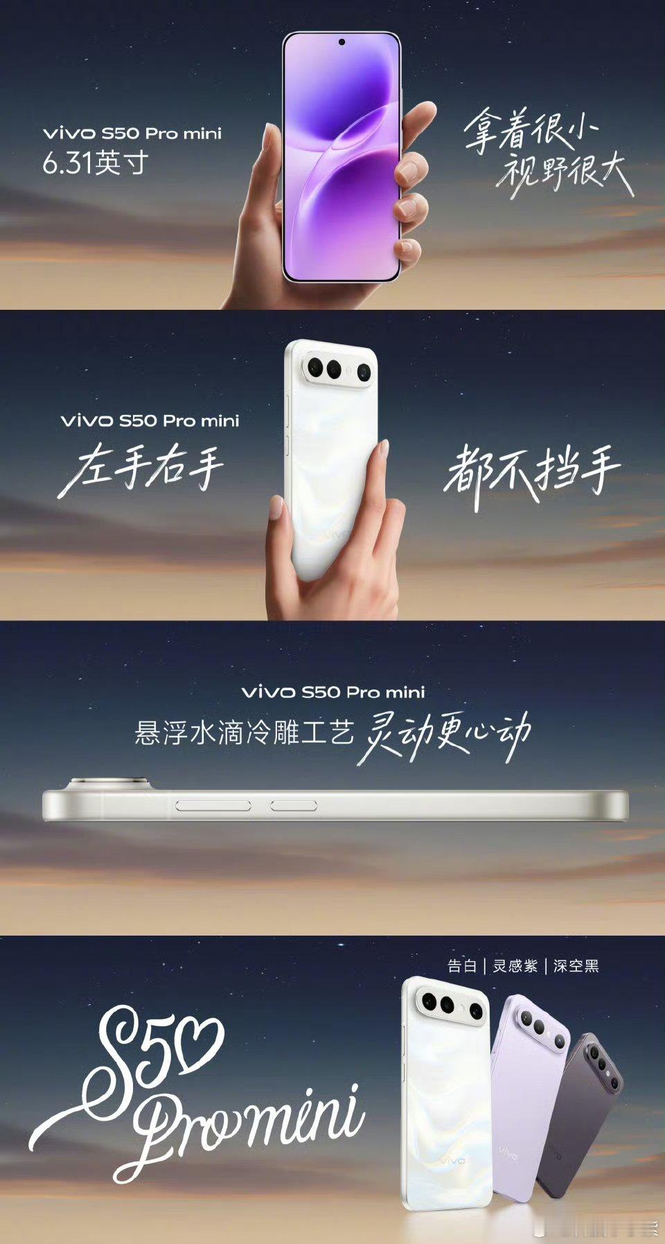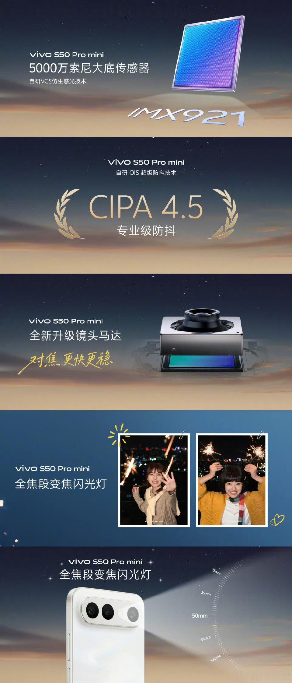 vivo S50 Pro mini 总结下来就一句话:小屏党真的很爱!6.31英寸小直屏,单手操作超顺,揣兜塞包无压力;镜组上移不顶手,悬浮水滴冷雕工艺,颜值手感都在线。全球首批第五代骁龙8,LPDDR5X Ultra+UFS4.1,性能拉满,SGS 5年流畅认证,“视频回录”一键存高光。mini机身塞下6500mAh硅负极电池,90W有线+40W无线双闪充,还能反向充电,续航无忧。索尼IMX921大底+VCS技术,F1.57大光圈,OIS防抖+升级马达,夜景抓拍都稳;全焦段变焦闪光灯,补光均匀立体,光差再大也出片。vivo S50 Pro mini