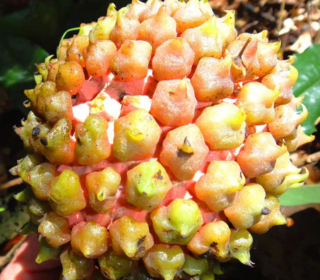 这种矮小到中等高度的稀有树种产自委内瑞拉、哥伦比亚、苏里南和邻国巴西的低地雨林,是番荔枝的近亲,它结出了一种真正壮观的果实,不仅看起来令人惊叹,而且可以食用,毫无疑问,它是周围最美味的杜盖叶树。果实呈球状,大小约为苹果,果皮呈深粉红色,由许多突出的深红色鳞片保护。果肉呈深黄色至红色,有甜味,据说有杏子的味道,带有菠萝蜜的味道。杜鹃显然尚未种植,但将成为热带气候下最令人兴奋的果树。