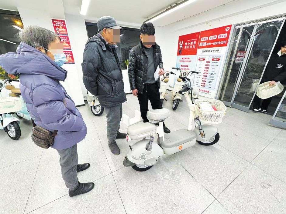 12月10日晚间,东城区一家电动自行车门店内,消费者通过以旧换新购买了一辆新国标电动自行车。