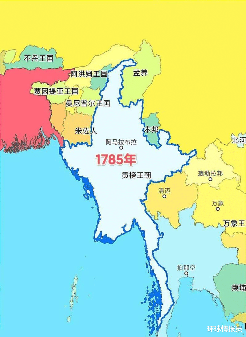 19世纪初,缅甸以缅北为基地,向西入侵阿萨姆、曼尼普尔等地。与正在印度殖民扩张的英国人迎头相撞,并引发第一次英缅战争。