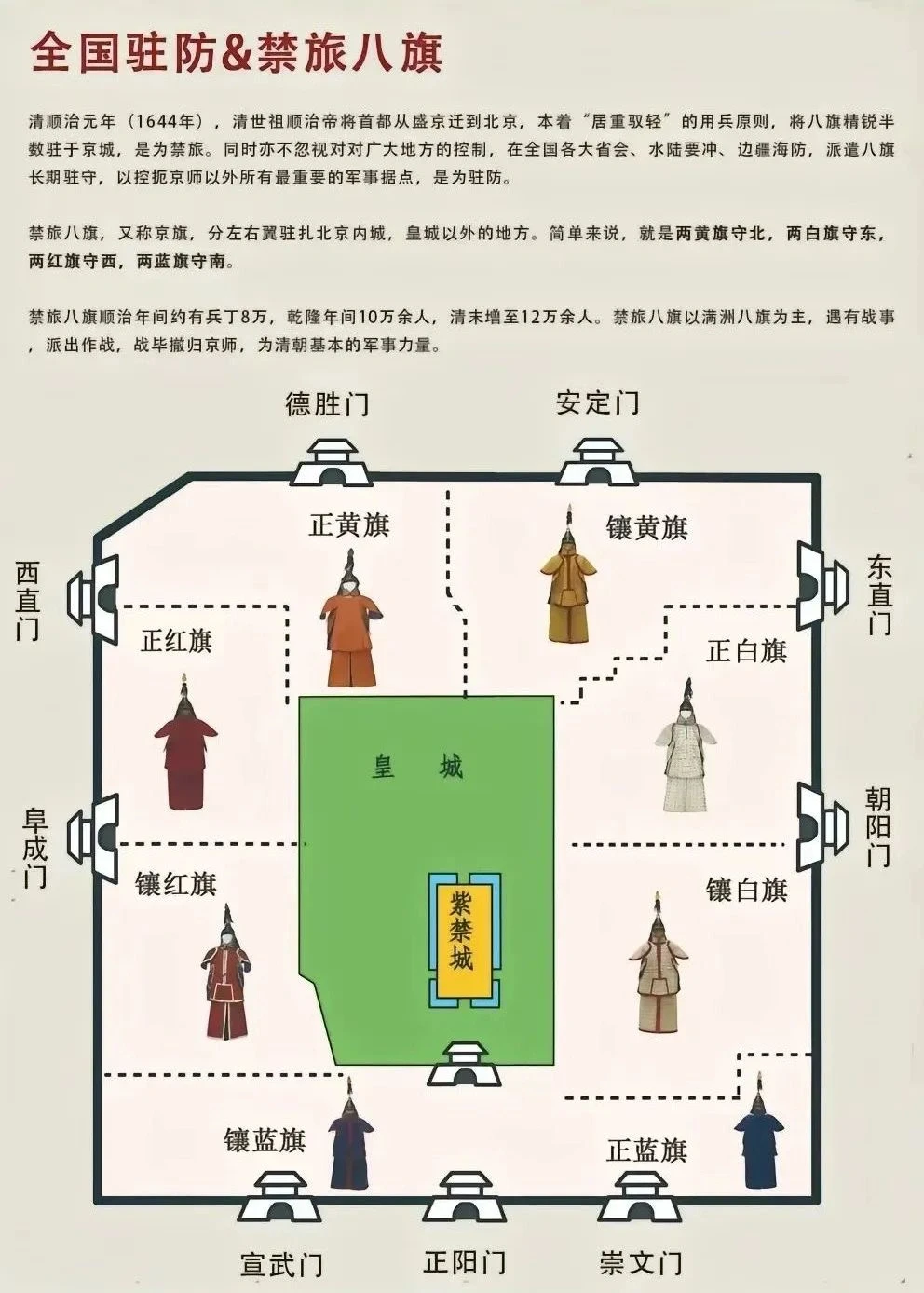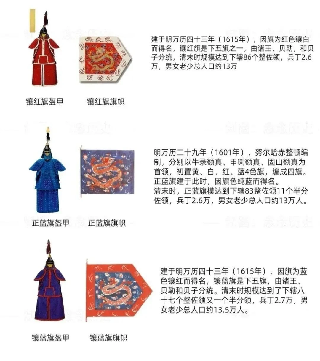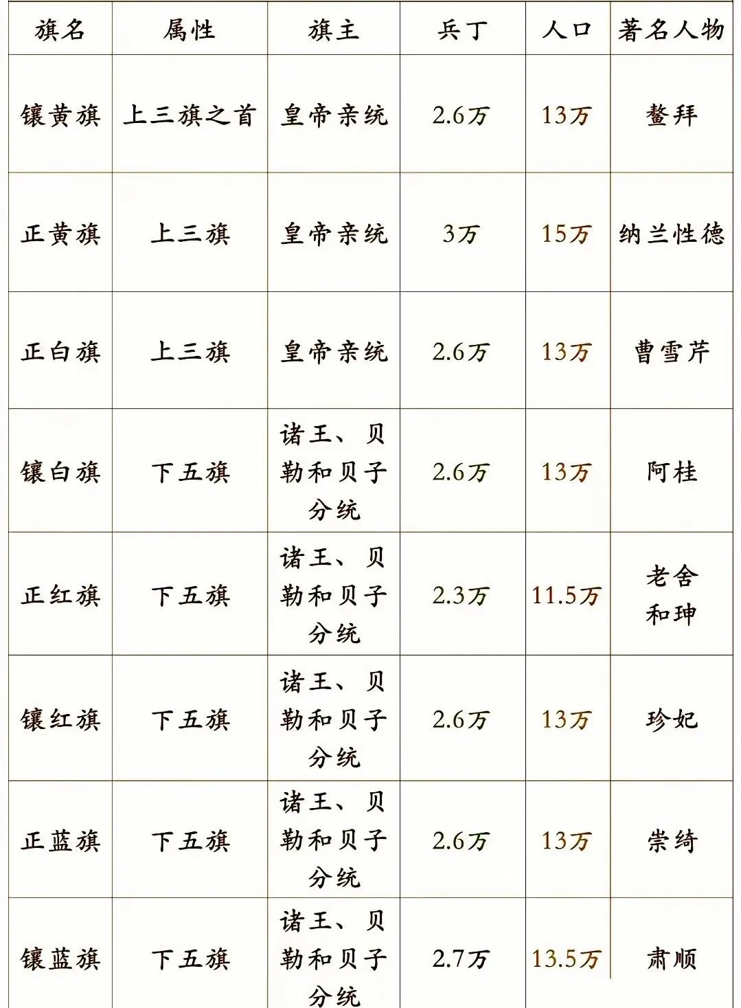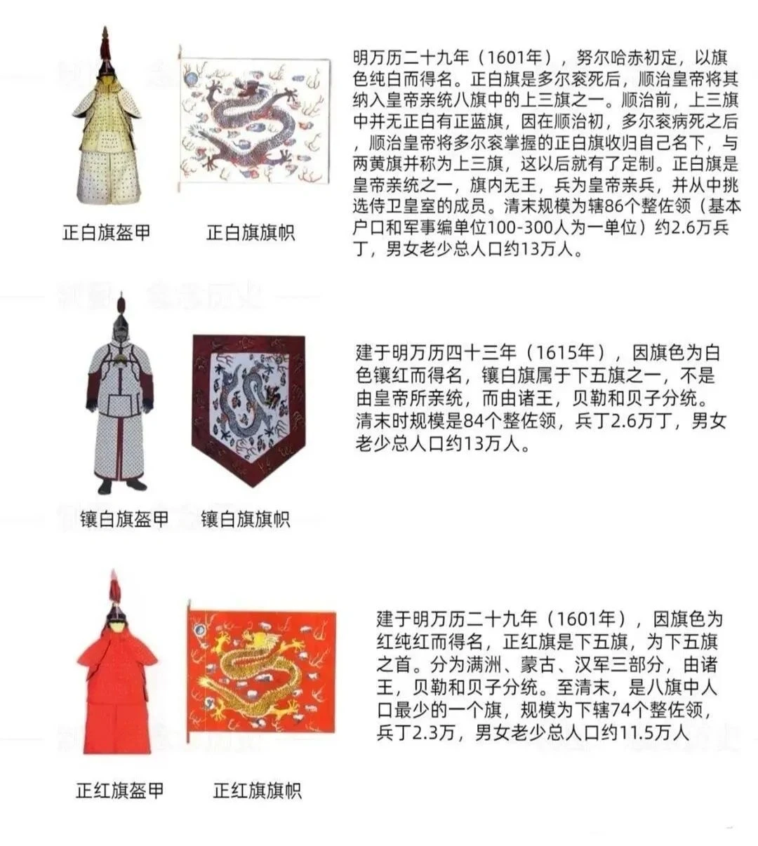 八旗制度清朝的基本制度,贯穿于清朝始终。清朝八旗分为满洲八旗、蒙古八旗和汉军八旗,分别创立于1615年、1635年和1642年。